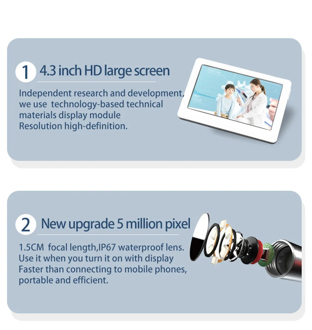 Диаметр линзы: 3,9 мм объективДисплей: 4,3 дюймовПиксели объектива: 1080P/2 МПЭффективное фокусное расстояние: 1,5 смДлина кабеля объектива: 1,2 мЕмкость аккумулятора: 1200 мА · чСрок службы: около 2,5 чКамера: ПоддержкаВстроенный источник света: 6 Регулируемых светодиодных лампАксессуары для ушей: 9 шт.