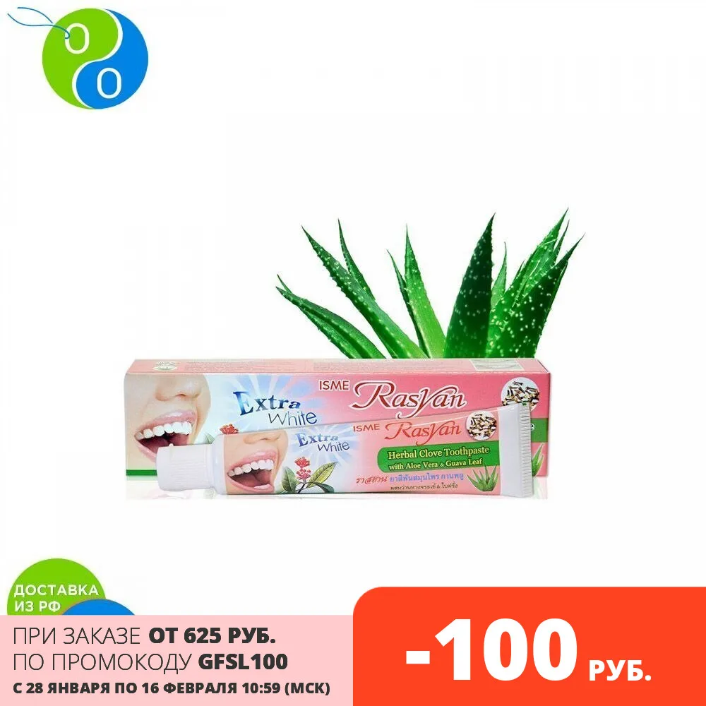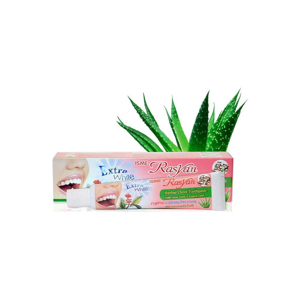 Зубная паста Rasyan с гвоздикой экстрактом листьев гуавы и алое вера – это один из самых популярных в мире тайских продуктов. Известность ей принести натуральный состав, необычайная эффективность и невысокая цена. Паста хорошо вспенивается и расходуется достаточно экономично: на зубную щетку достаточно выдавить совсем маленькую горошину. Она обеспечивает свежее дыхание, устраняет неприятный запах, вызываемый продуктами жизнедеятельности микроорганизмов, а также превосходно отбеливает зубы. Паста не содержит жестких абразивных частичек, поэтому не повреждает тонкую эмаль и не травмирует чувствительные десны. Она мягко и бережно полирует зубы, постепенно удаляя налет от чая, кофе и табака, а также заживляет царапины и останавливает воспалительные процессы в ротовой полости. Состоит из натуральных компонентов, в том числе гвоздичного и касторового масел, камфоры, масла перечной мяты, ментола, борнеола, листьев алоэ вера и гуавы, способствующих устранению налета от кофе, табака, чая и препятствующих появлению зубного камня. Имеет отбеливающие свойства, снижает восприимчивость зубов к перепадам температуры, сохраняет свежесть дыхания в течение длительного времени.
