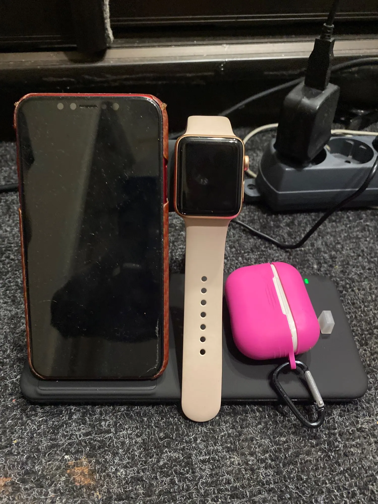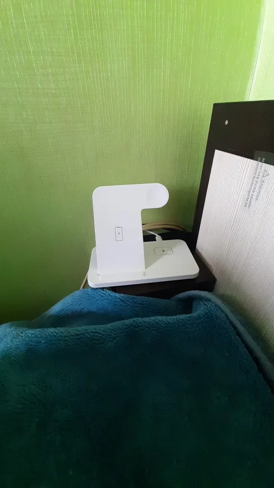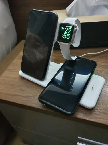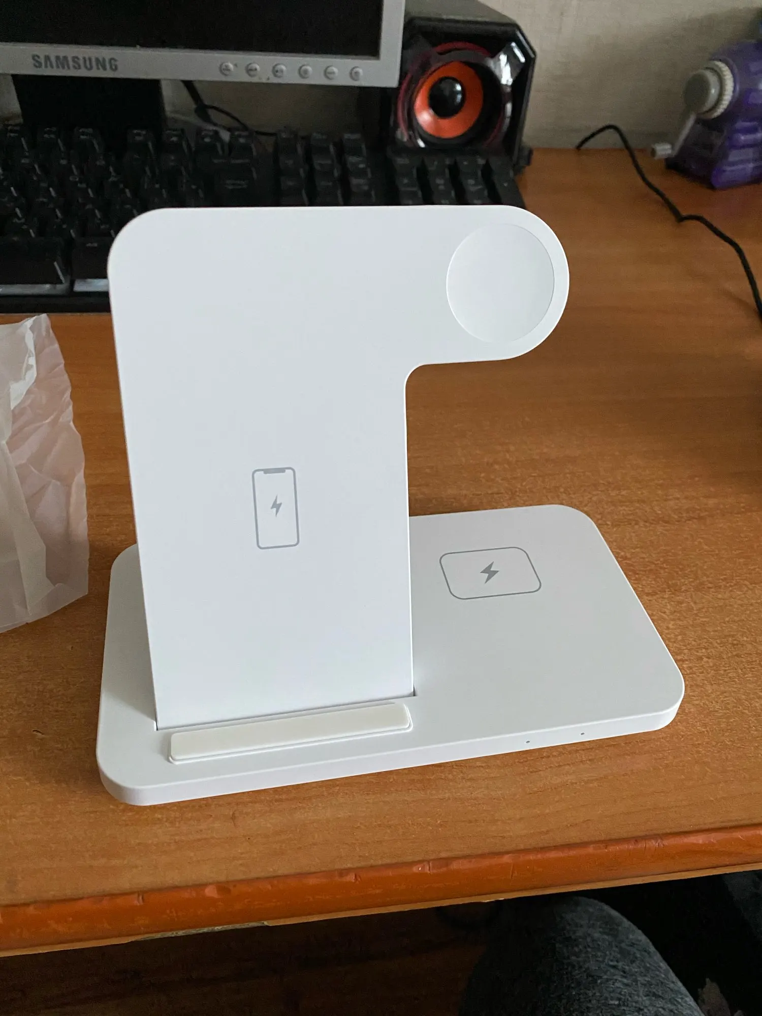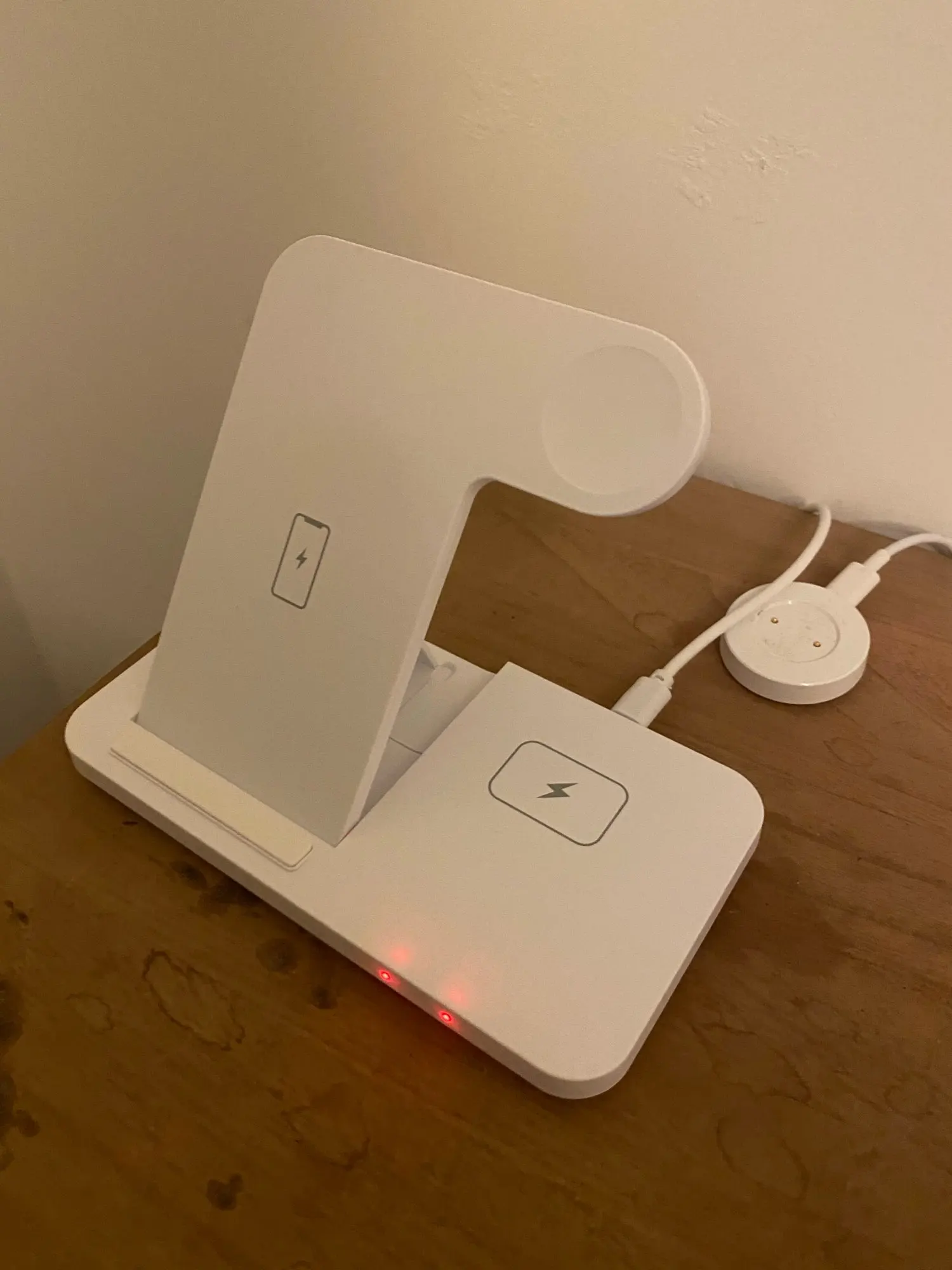 Отлично работает с iPhone 12, AirPods Pro и часами. Маленький синий свет при зарядке, слишком плохо, что не в состоянии снять его для черной ночи.