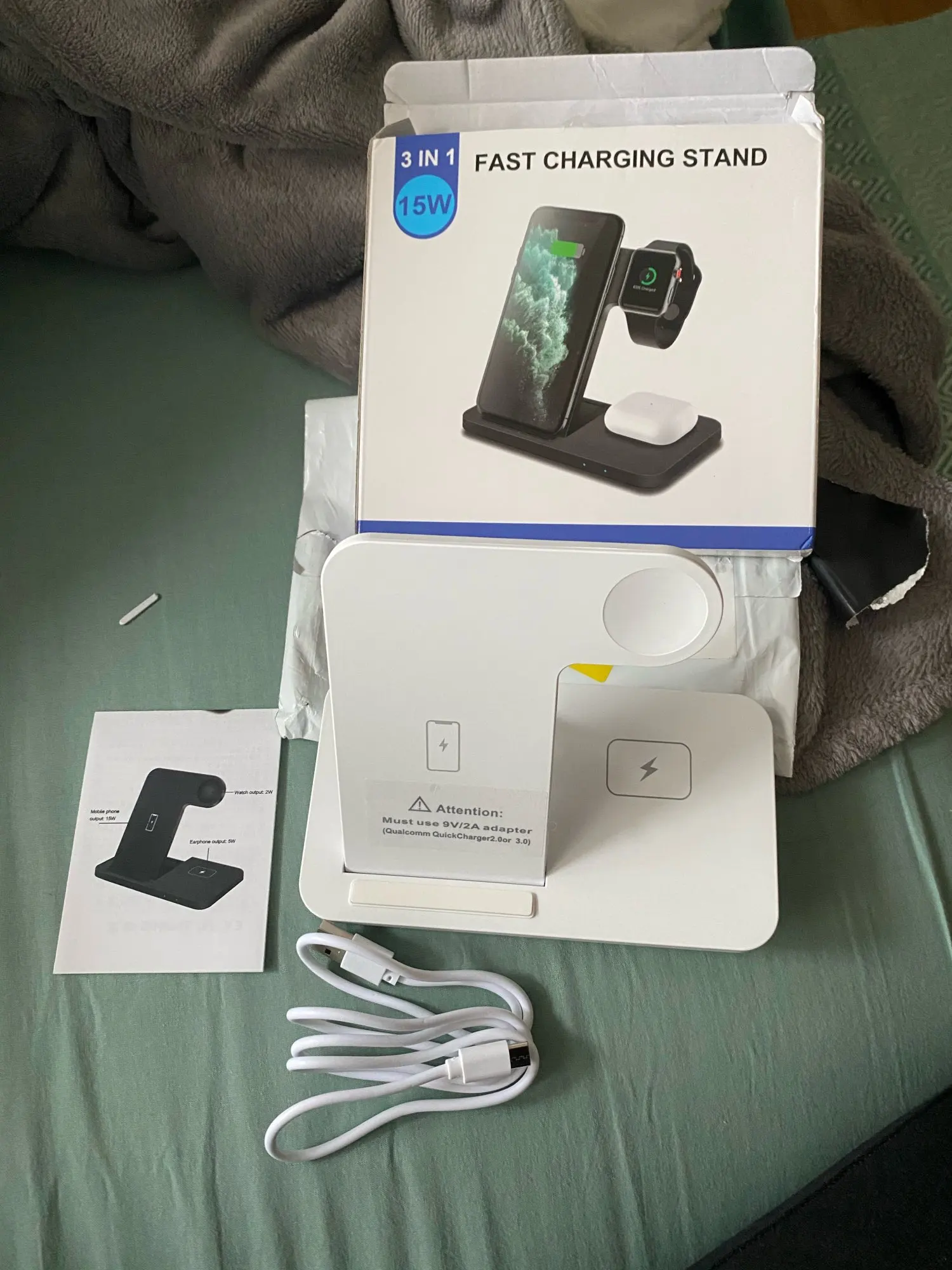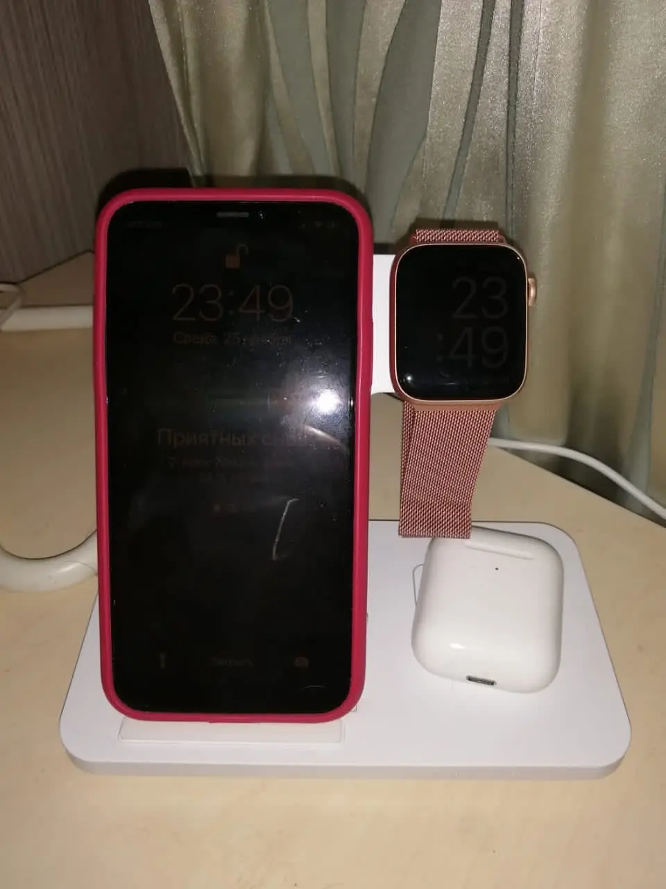 Огонь зарядка! Заряжает всё! Айфон 12 про Макс, часы 5, наушники беспроводные и второй телефон))) Единственный минус - чёрный язычок(держатель) у белой зарядки, к чему его такой приделали не понятно! Доставили кстати очень быстро! Примерно неделю. Получила свой подарочек прям 31 декабря через ячейку!