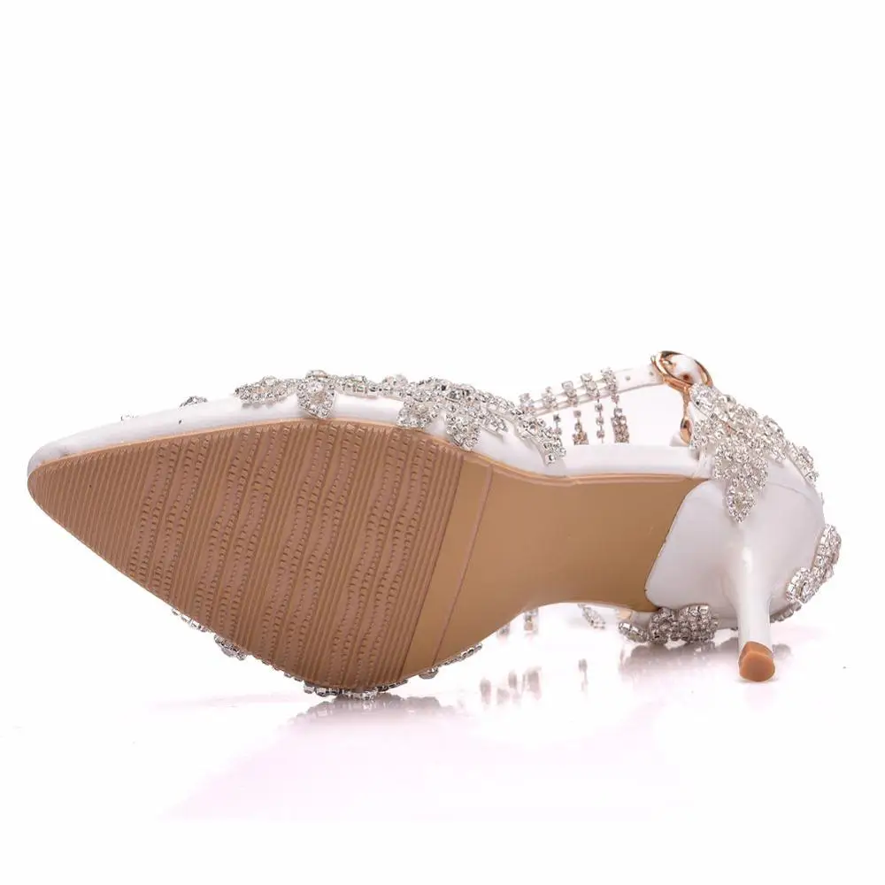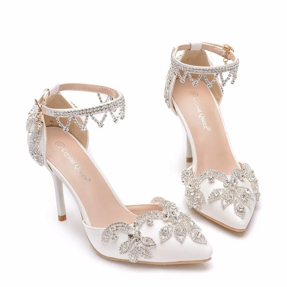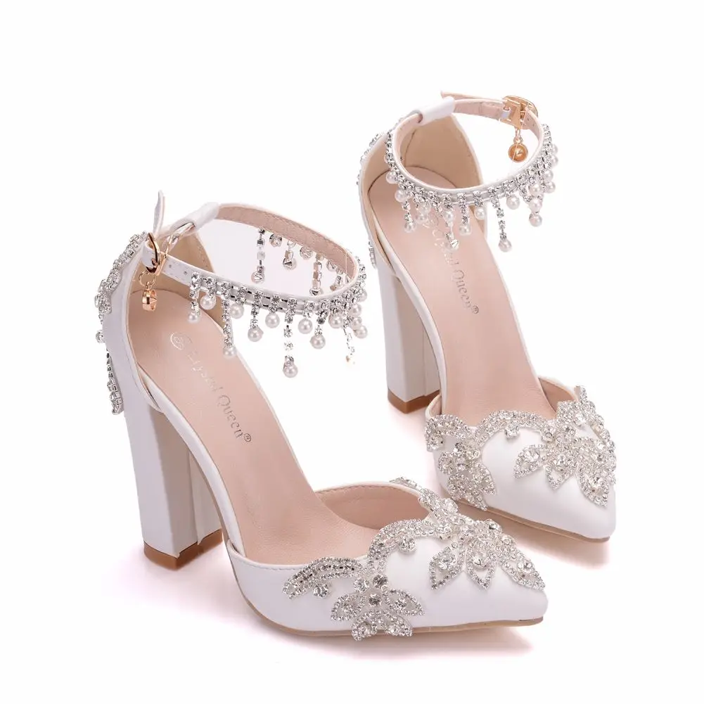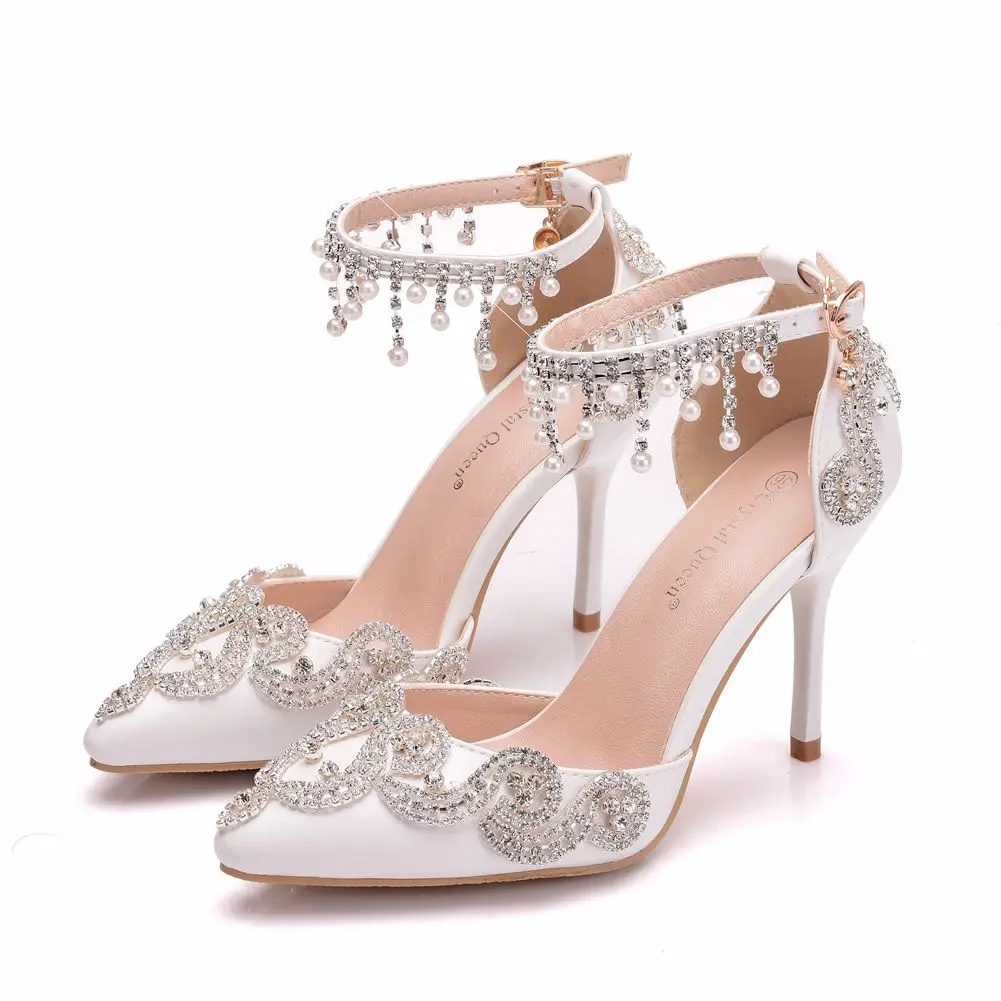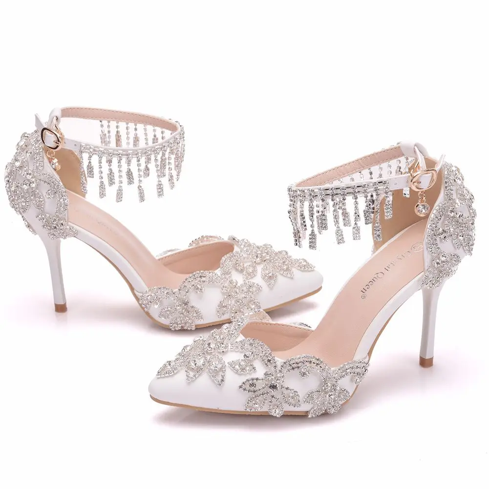 Женские белые туфли со стразами; Браслет с кисточкой Свадебные туфли; Туфли для невесты; Босоножки на высоком каблуке; Женские модельные туфли-лодочки на танкетке