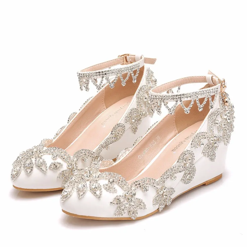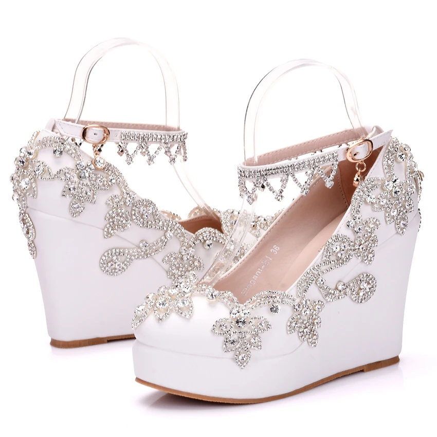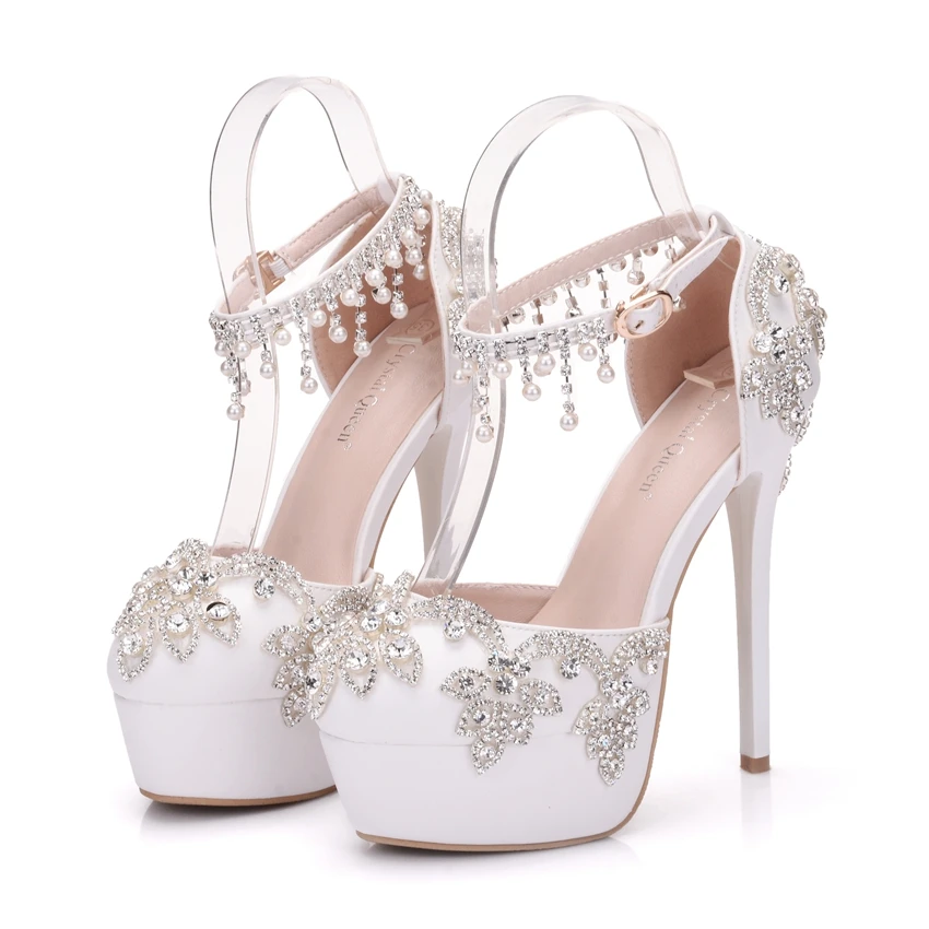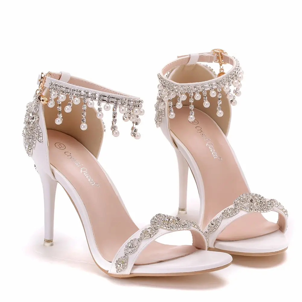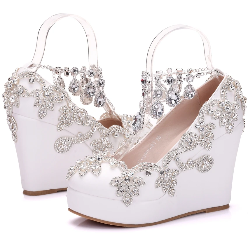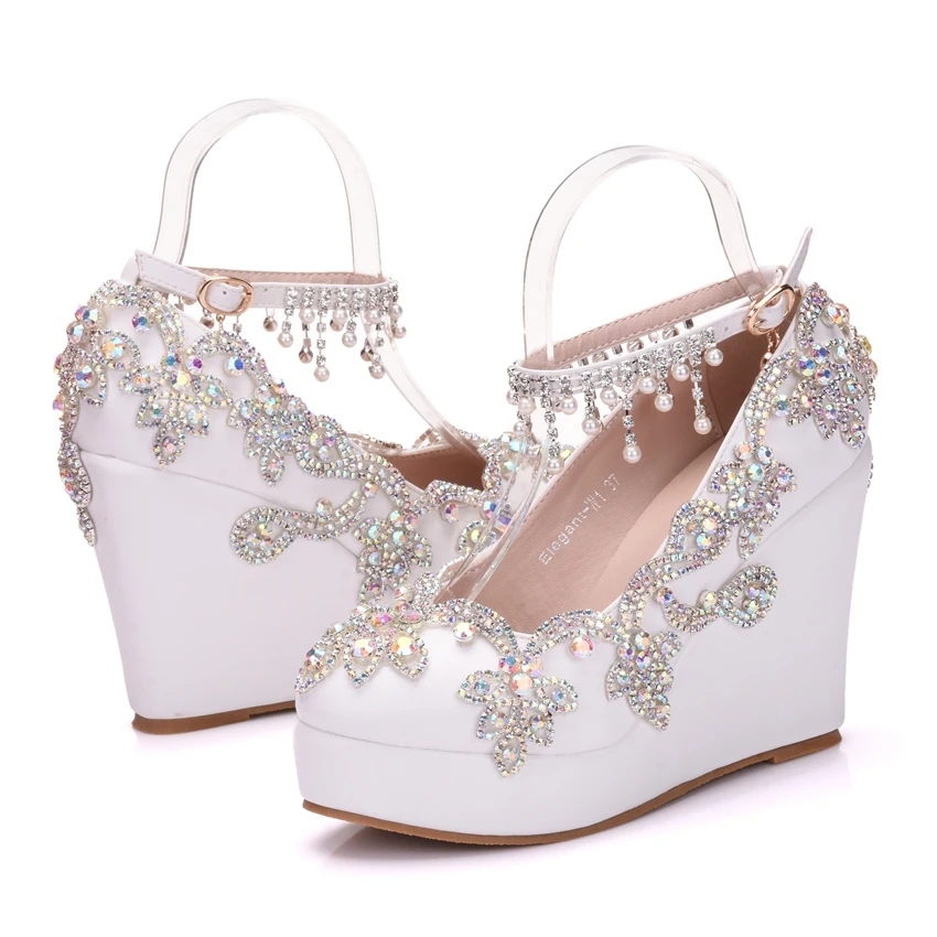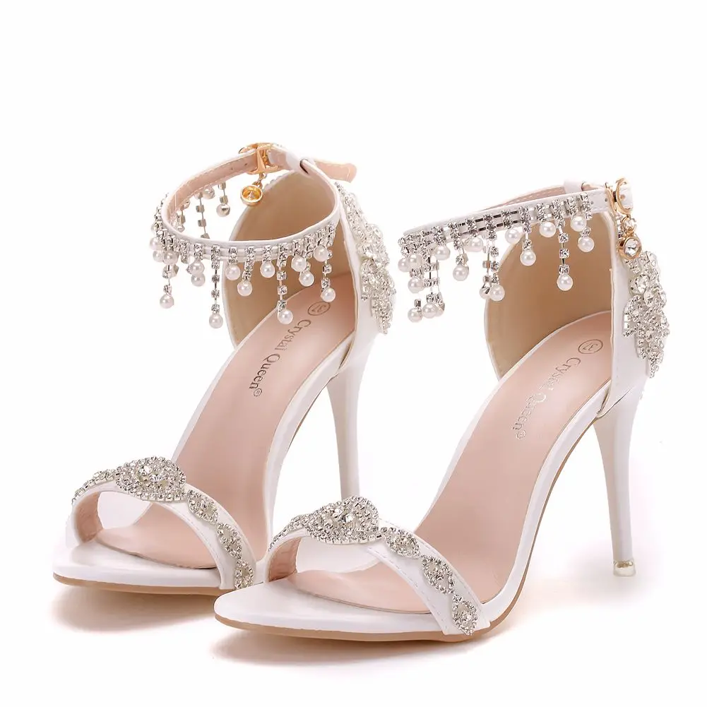Женские белые туфли со стразами; Браслет с кисточкой Свадебные туфли; Туфли для невесты; Босоножки на высоком каблуке; Женские модельные туфли-лодочки на танкетке