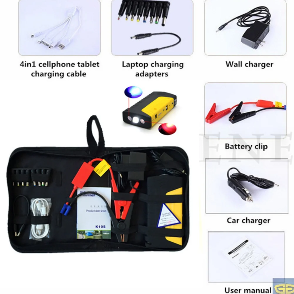 Стартер для автомобиля (внешний аккумулятор) * 1Зажимы для аккумулятора (красный = Положительный; Черный = отрицательный) * 1Настенное зарядное устройство * 1Автомобильное зарядное устройство * 13 в 1 кабель для зарядки * 1Разъем для ноутбука * 8Зарядный кабель для ноутбука * 1Инструкции на английском языке * 1Чехол для розничного инструмента * 1