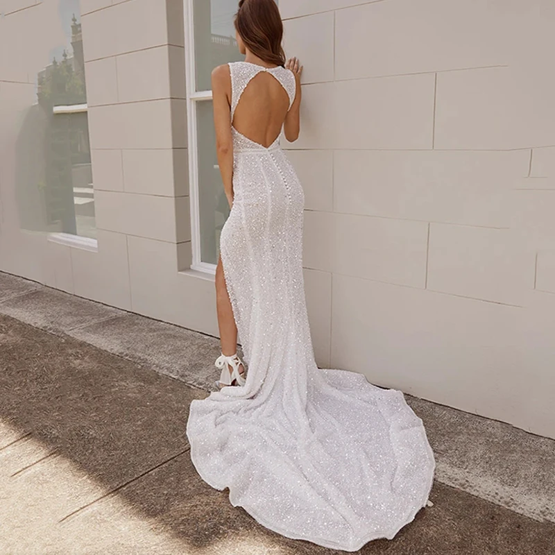 Женское вечернее платье с разрезом, блестками, V-образным вырезом