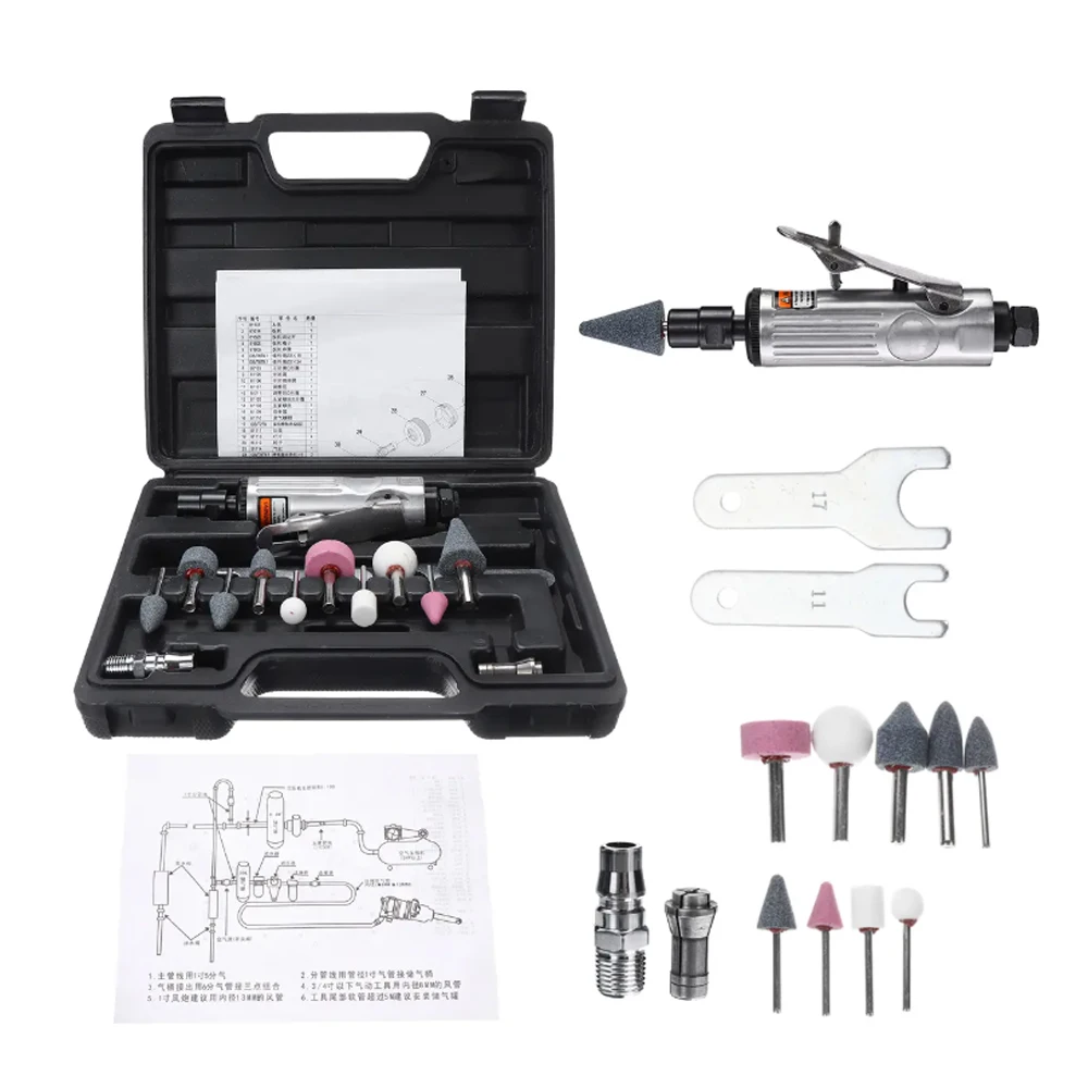 1 x Воздушный шлифовальный станок2 х гаечный ключ1 x цанговый патрон 1/8 дюймов-3 мм1 x цанговый патрон 1/4in - 6 мм5 х хвостовик камней 1/4in - 6 мм5 x хвостовик камни 1/8in - 3 мм1 x байонетное быстрое соединение 1/4in1 x чехол для переноски