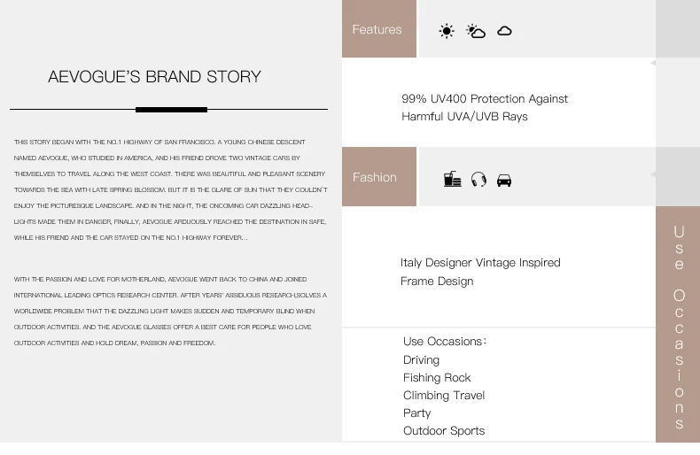 Product Function100% UV400 Protection Against Harmful UVA/UVB Rays