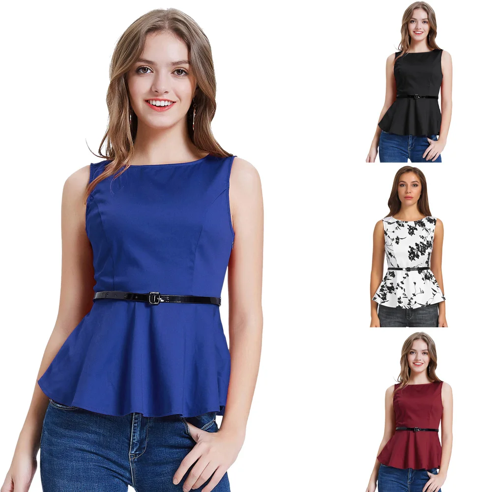 Блузка женская с цветочным принтом, топ без рукавов, с глубоким вырезом и поясом, с баской, Повседневная Модная приталенная рубашка, одежда, лето
