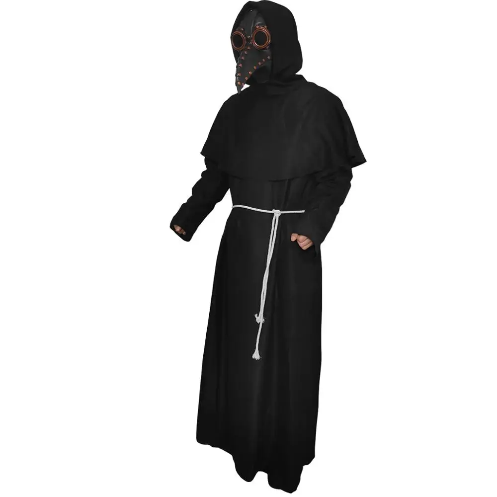 1. Костюм включает:Этот костюм для взрослых «Доктор чумы» включает черный халат с накидкой с капюшоном и одну черную маску чумы.