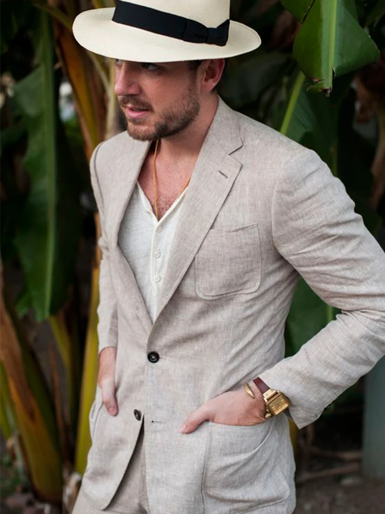 ANNIEBRITNEY Beige 2 Piece Men Slim Fit Linen Summer Suit