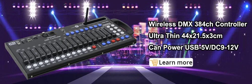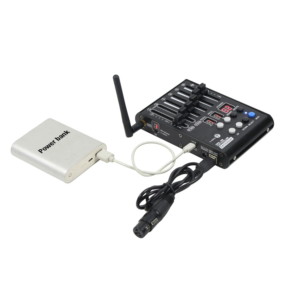 * Вы можете использовать зарядное устройство мобильный телефон для питания консоли через USB 5 В в порт на боковой части контроллера. * Может управлять до 9 смарт-лампами по 6 каналов каждый, в общей сложности 54 канала * Беспроводной DMX 2,4G ISM 126 * 6 фейдеров спереди для прямого управления * Входы и выходы DMX в 3 pin XLR