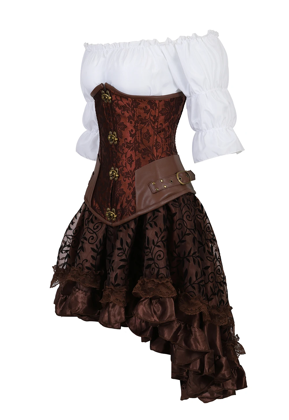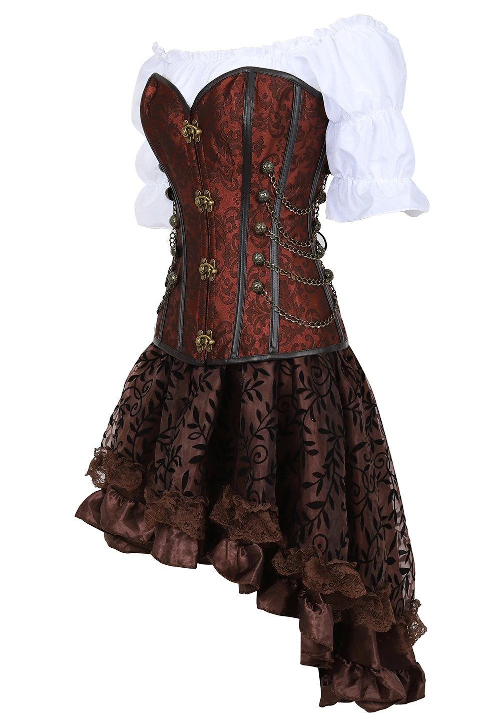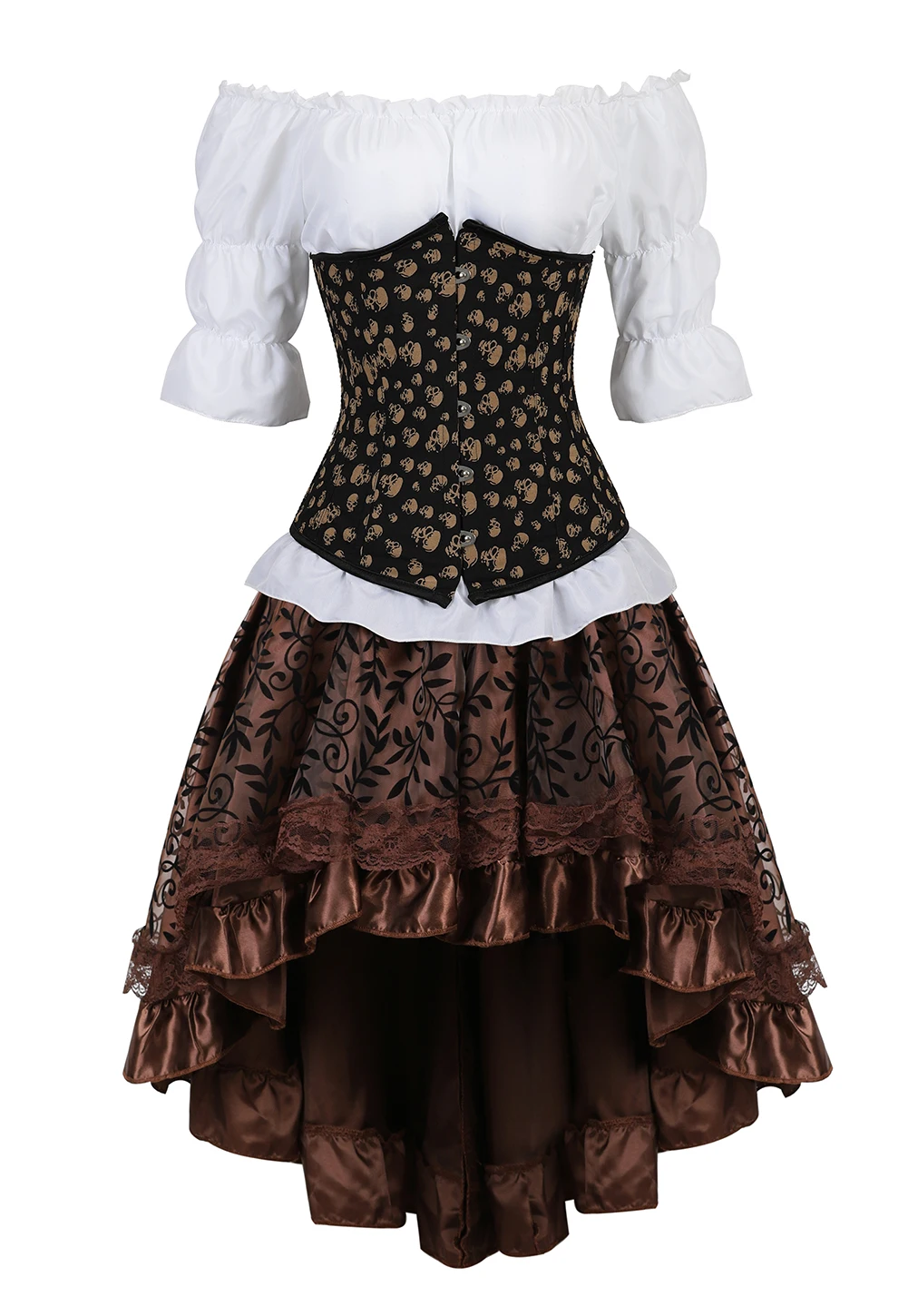 Корсет-платье для женщин в стиле стимпанк, Готический Бурлеск, белый топ с открытыми плечами, пиратский костюм, косплей, Женский размера плюс, 3 шт.