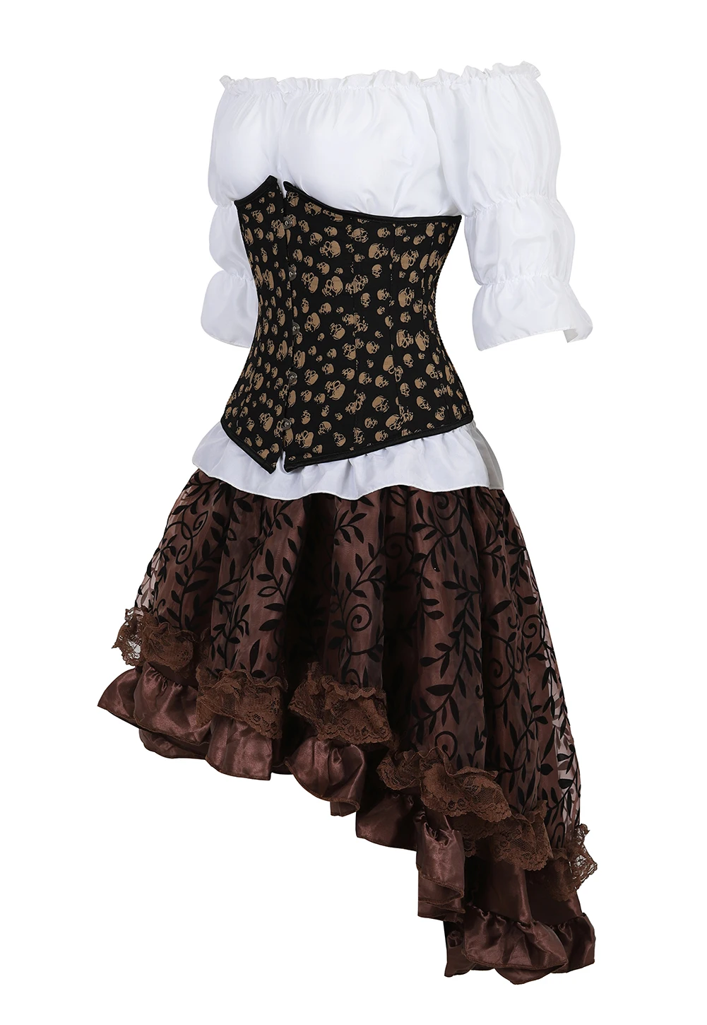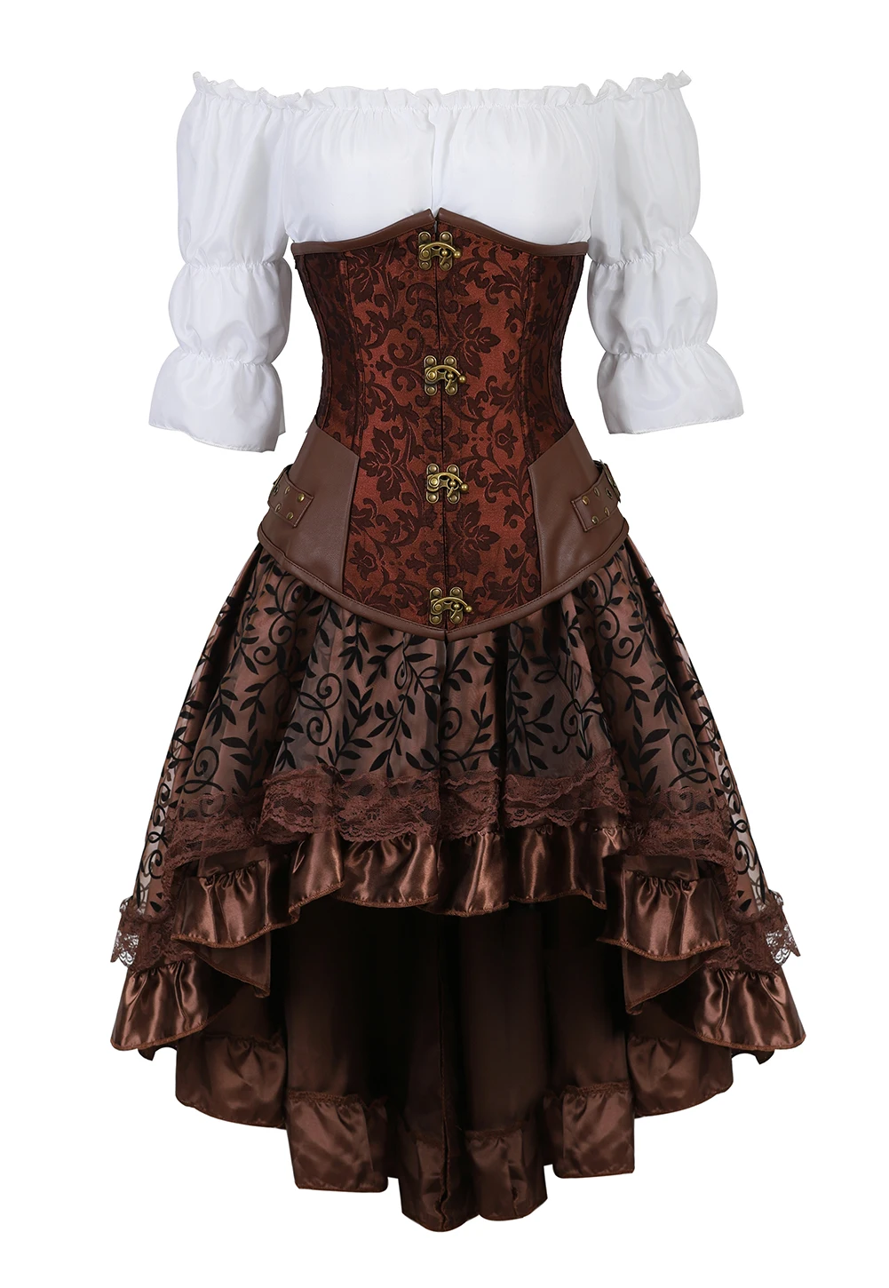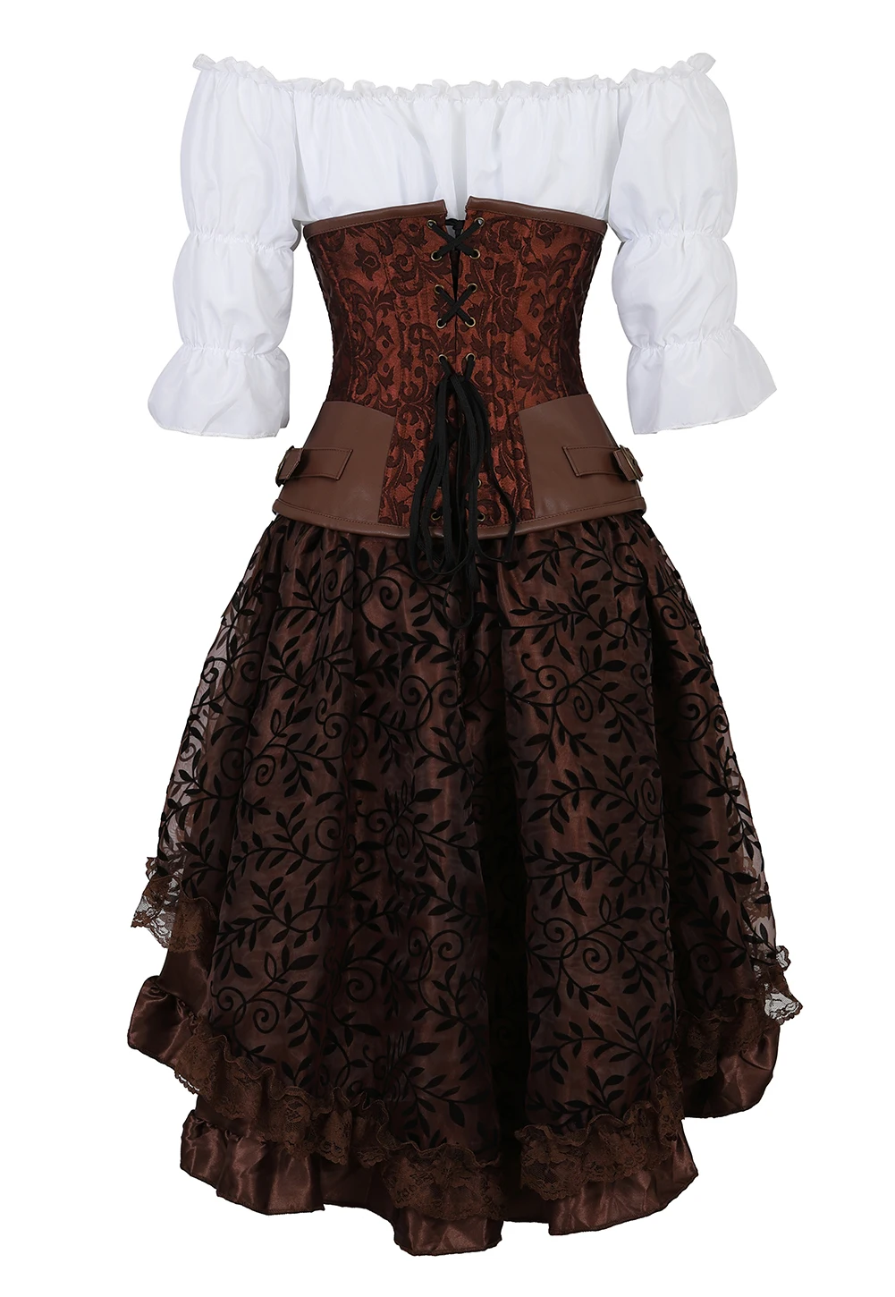 Корсет-платье для женщин в стиле стимпанк, Готический Бурлеск, белый топ с открытыми плечами, пиратский костюм, косплей, Женский размера плюс, 3 шт.