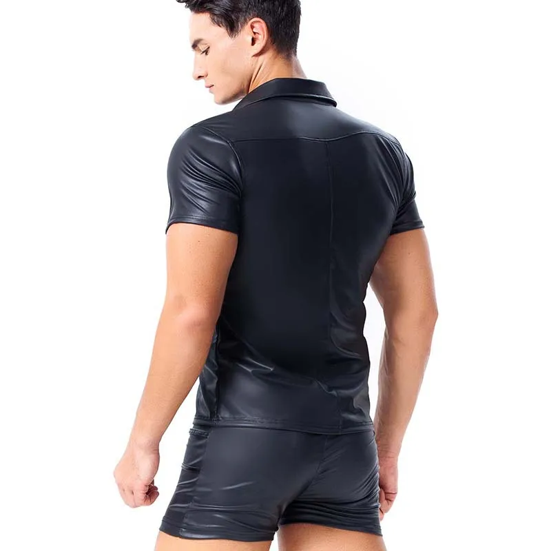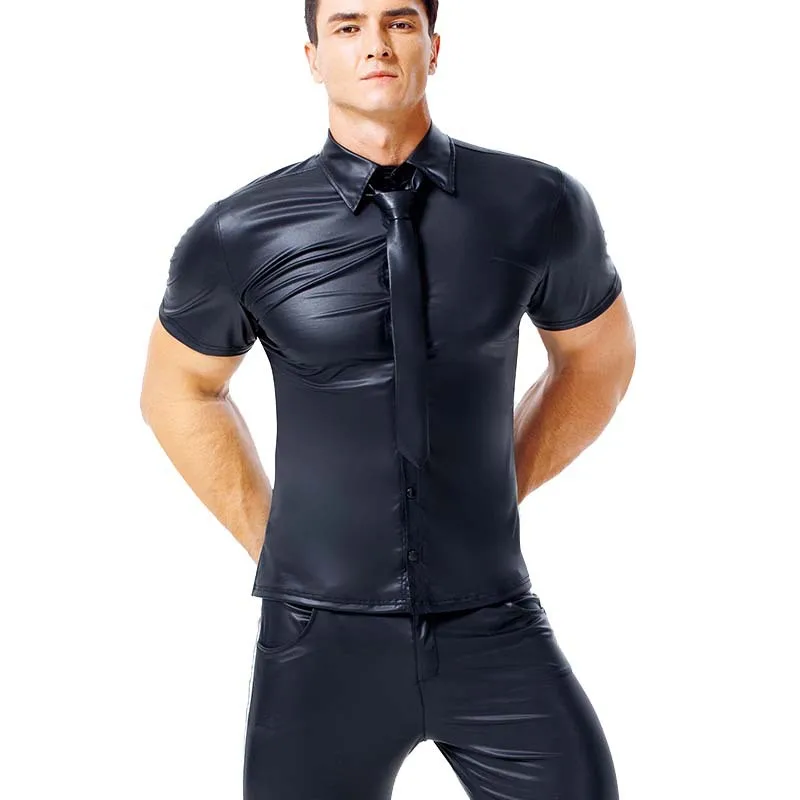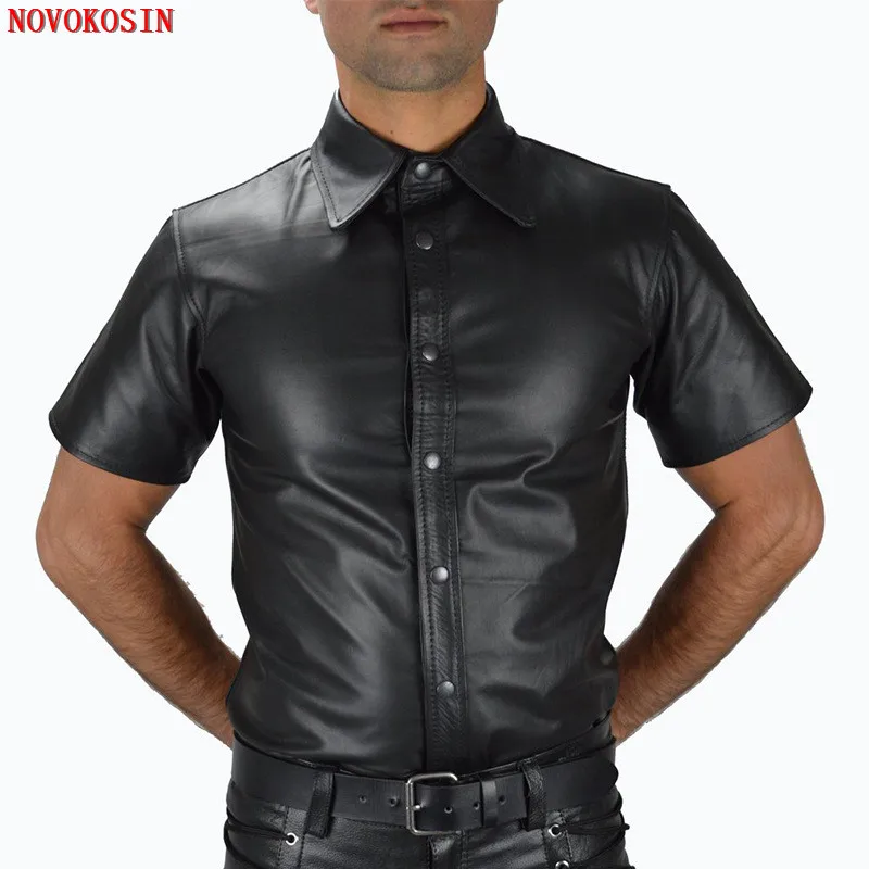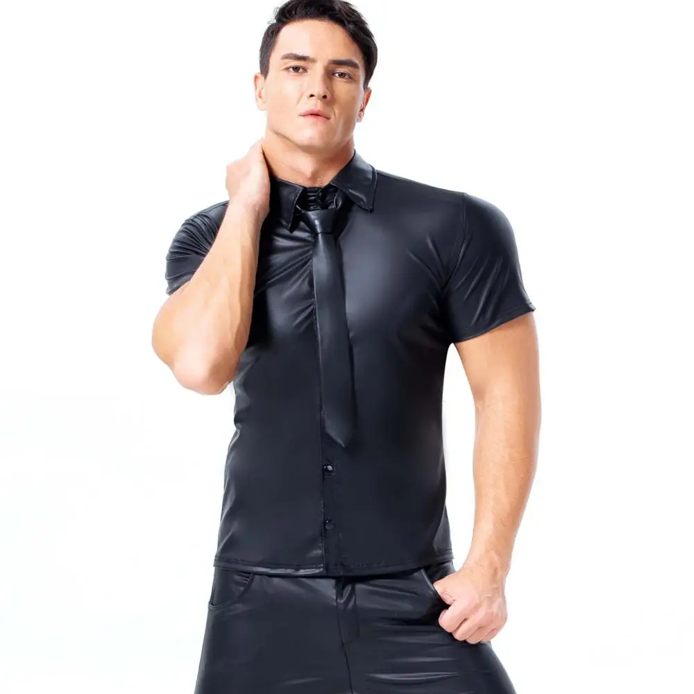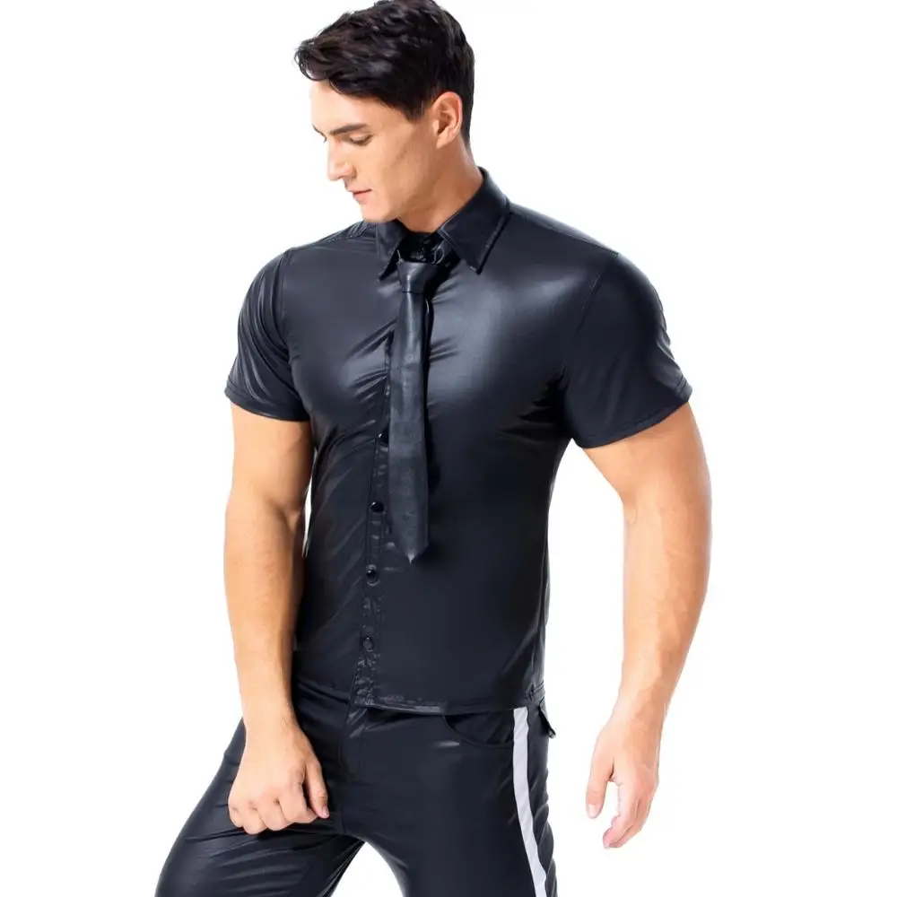 XX151 S-3XL 2020 модные черные мужские Сексуальные облегающие футболки из искусственной кожи с коротким рукавом и пуговицами