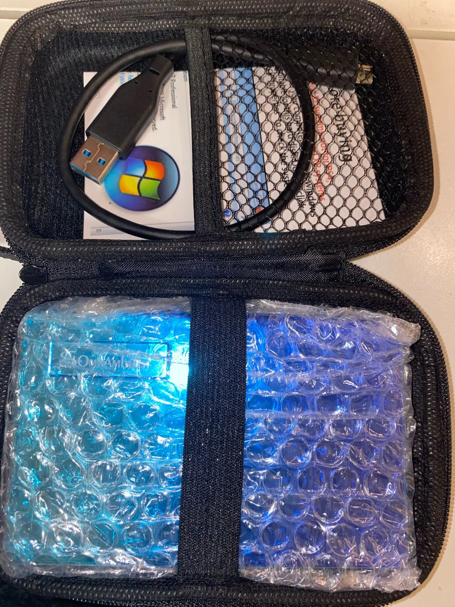 Доставка за 10 дней, все, как в описании. Удобный чехол для хранения и какая-то непонятная штука в подарок. Все работает, ноутбук видит диск без проблем .