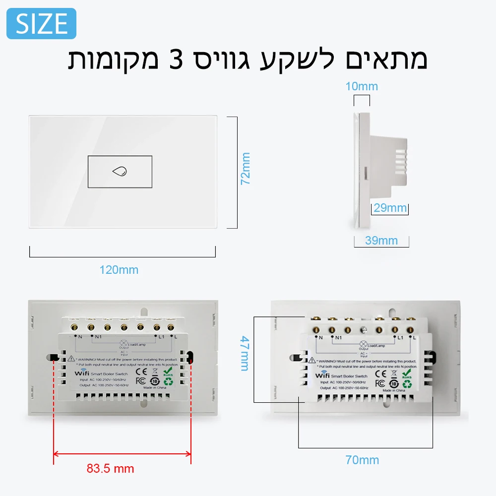 * Номер модели: CS-WFBS-US * Материал: закаленное стекло + АБС-пластик * Вход Напряжение: AC100-240V ~ 50/60Hz * Максимальный ток: 20А * Максимальная мощность: 4400 Вт • Энергопотребление в режиме ожидания: менее 0,5 W * Wi-Fi Стандартный: IEEE 802,11 b/g/n 2,4 ГГц * Приложение: Tuya Smart /Smart life * Сертификация: CE/FCC/Rohs * Тип: стандарт США * Область применения: Израиль/США/Италия/Сербия/Кипр и т. Д. * Размер: 120*72*35 мм