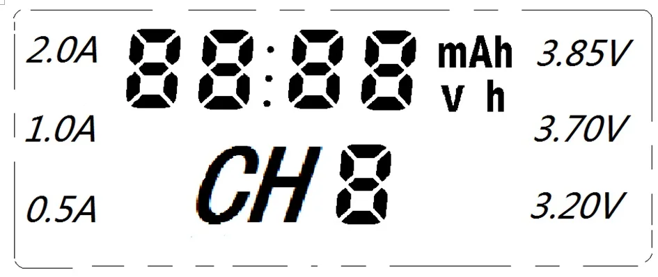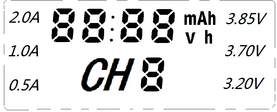 4. Встроенный цифровой трубный индикатор показывает состояние зарядки канала no в реальном времени. (CH), напряжение, ток, емкость времени и тип батареи Li-Fe 3,20 V/Li-ion 3,70 V/Li-ion 3,85 V (IMR); Когда два канала зарядки, общий ток будет не более 2А (когда только 1 шт батареи вставлены, Ток зарядки будет 2А, после того, как вторая батарея вставлена, ток будет автоматически снижен до 1А; Когда зарядка заканчивается, он показывает «полный»;