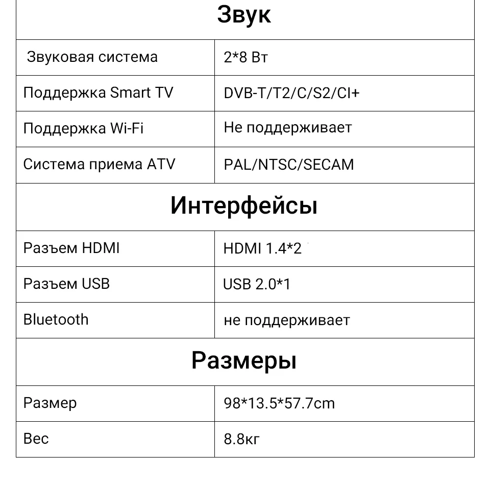 Нормальный телевизор. Подключил антену, настроил Wi-Fi - вопросов пока нет. Осталось ножки вкрутить но это уже хозяйка подарка как скажет так и сделаем. Все просто и понятно, единственное что сначала не указал что телевидение кабельное и каналов не нашел, потом сбросил и с первичной настройки сделал как надо. Продавец-молодец, быстро и недорого.