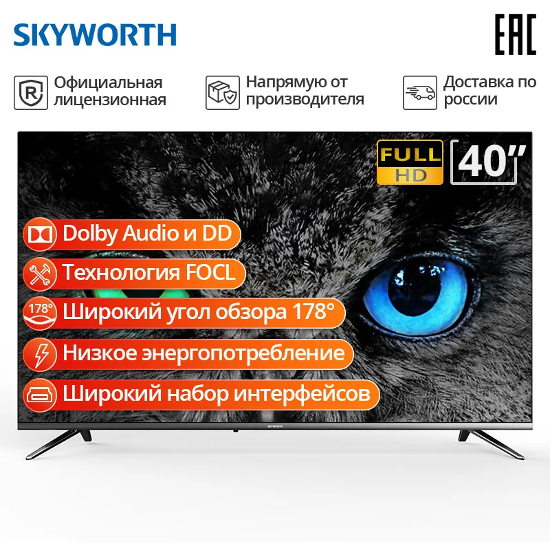 Телевизор 40 дюймов ТВ Skyworth 40W5 FullHD Smart TV Led Television Поддержка YouTube и Wi-Fi цифровых каналов