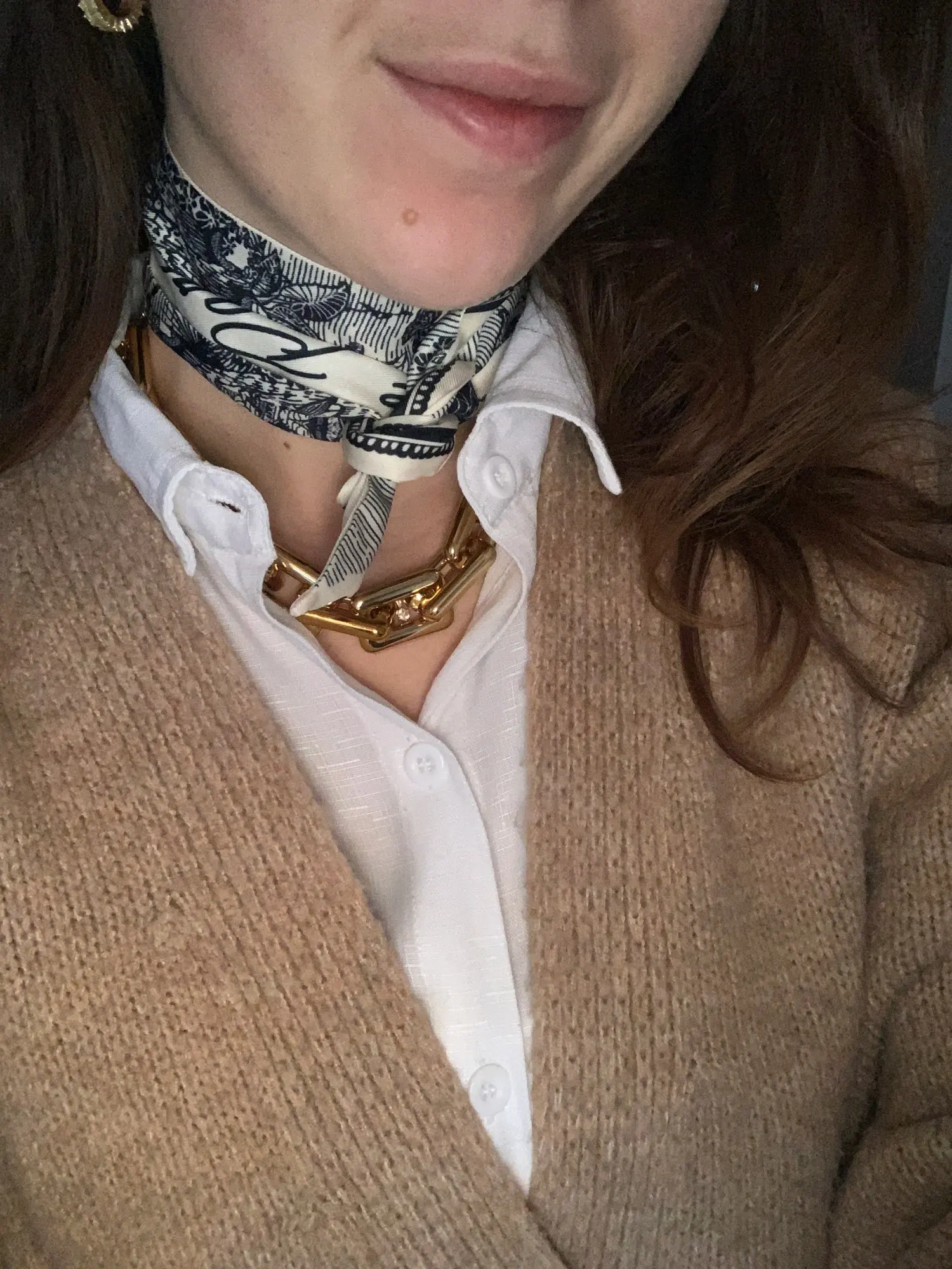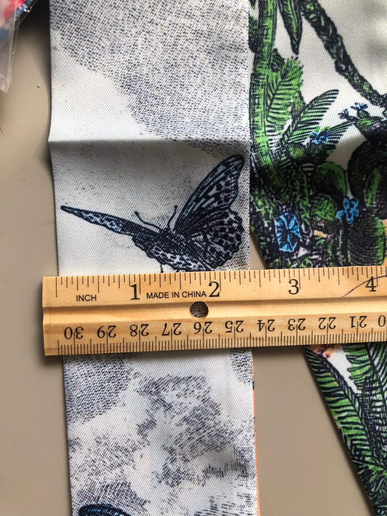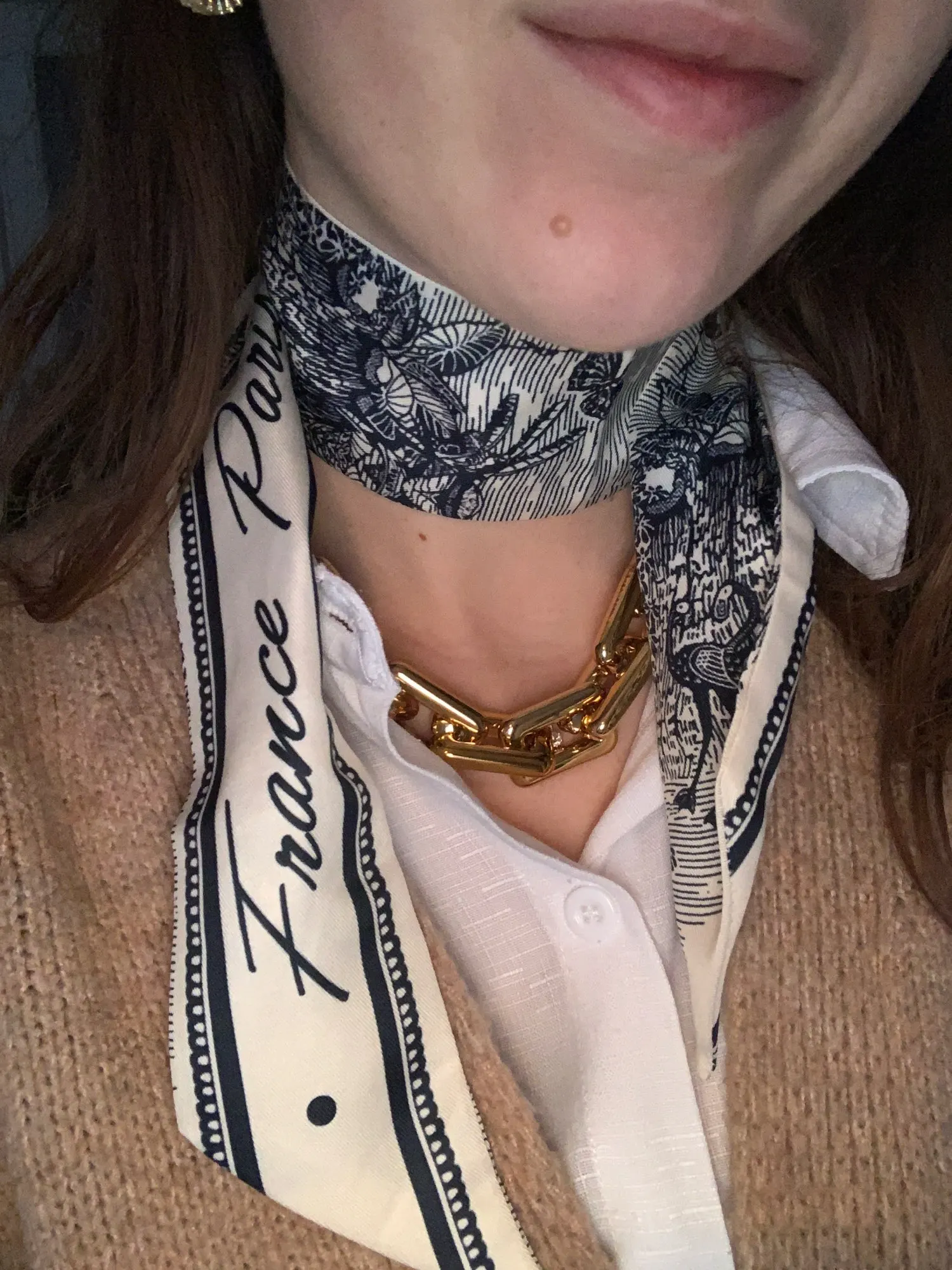Я не слишком уверен, что это шелк, как указано в информации о продукте, но он выглядит точно так же, как на представленных фотографиях! Это действительно хороший twilly!