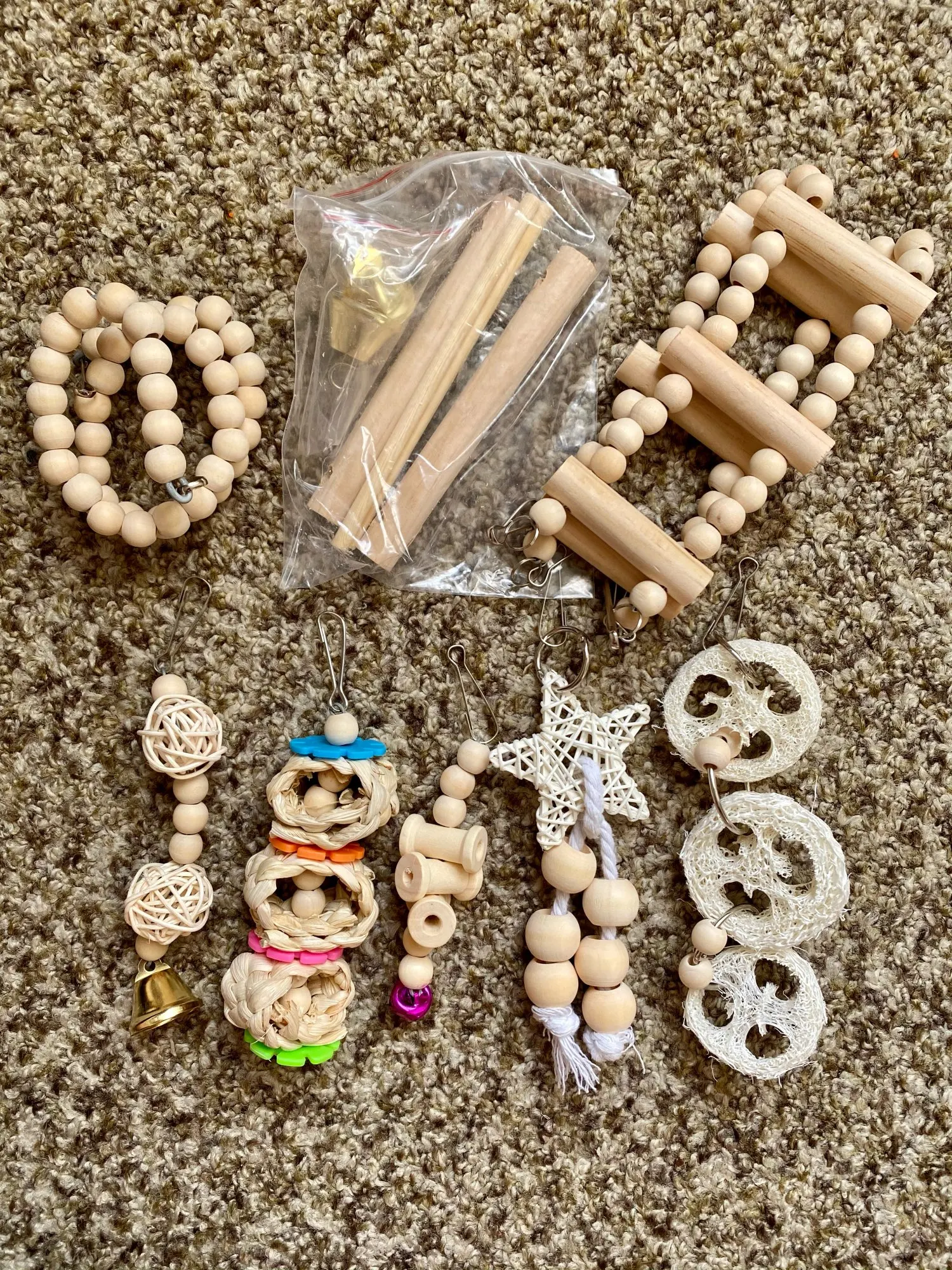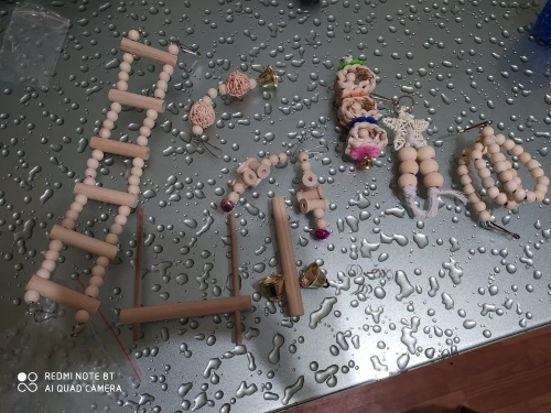 Набор хороший, единственное что не хватает колечка для того, чтоб второй колокольчик повесить. Игрушки для кореллы мелковаты, для волнистика, думаю, будет идеально. Птиц заценил только одну игрушку пока, но ему явно понравилось.