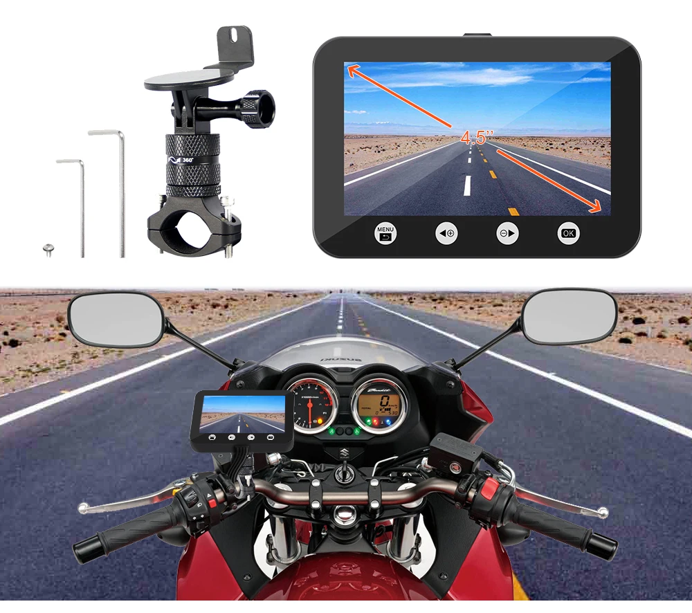 Видеорегистраторы VSYSTO 2CH разработаны специально для мотоциклов. Нацелен на упрощение использования камер для безопасности и удовольствия. F4.5-это 2-канальный видеорегистратор для мотоцикла full HD с большим экраном 4,5 дюйма. Вы можете легко установить монитор на руль, чтобы проверить вид сзади вашего велосипеда в режиме реального времени с помощью зеркального изображения (обратное изображение). Он добавляет отображение напряжения в реальном времени, функции обнаружения давления в шинах ODO и ODO, что позволяет всегда контролировать состояние вашего велосипеда.