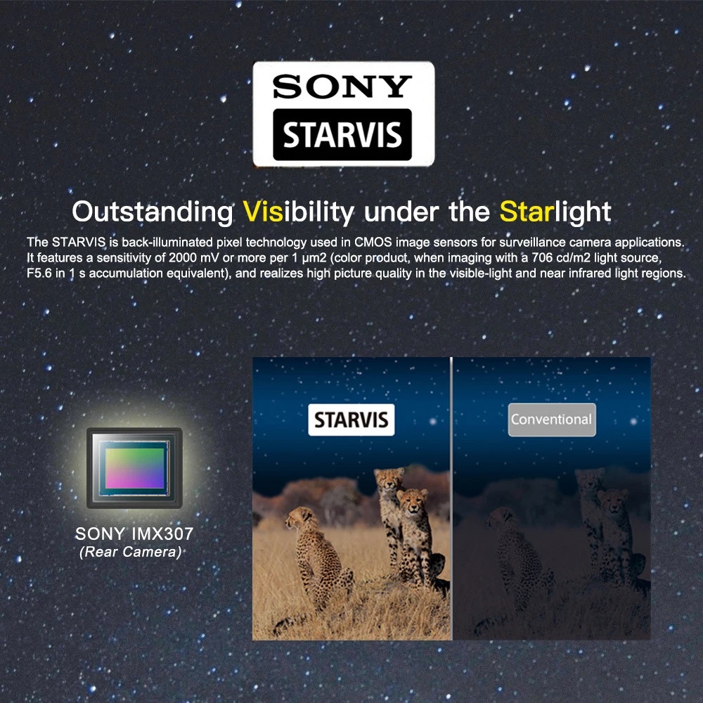 Видеорегистратор VSYSTO F4.5U оснащен процессором Mstar 8339CPU, который записывает со скоростью 25 кадров в секунду с разрешением 1920x1080. А Встроенный CMOS-датчик изображения Sony IMX307 и 6-стеклянная камера с объективом значительно улучшают ночное видение при слабосветильник щении, делая ваше вождение более безопасным ночью.