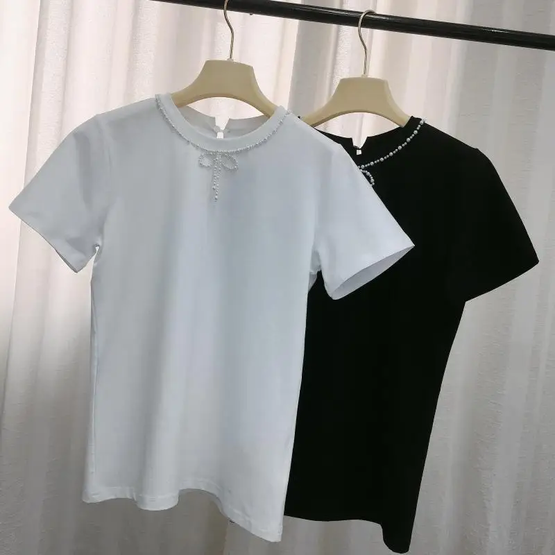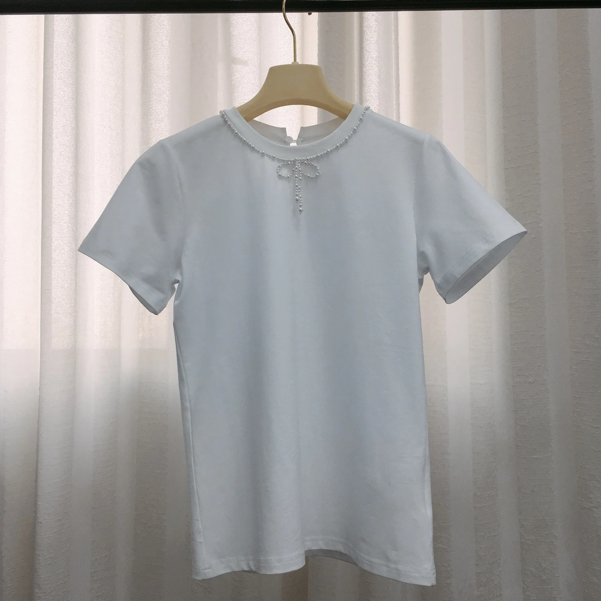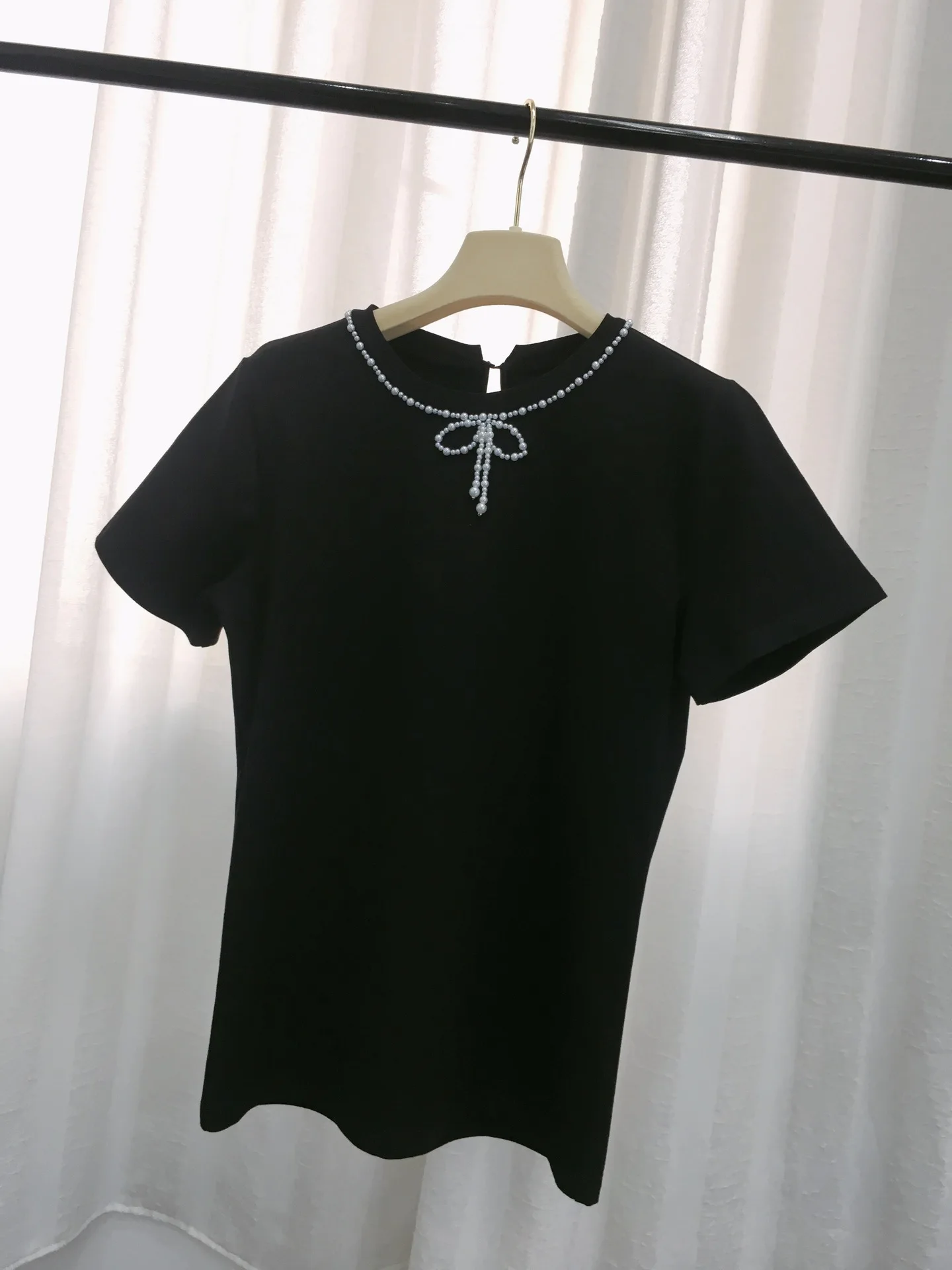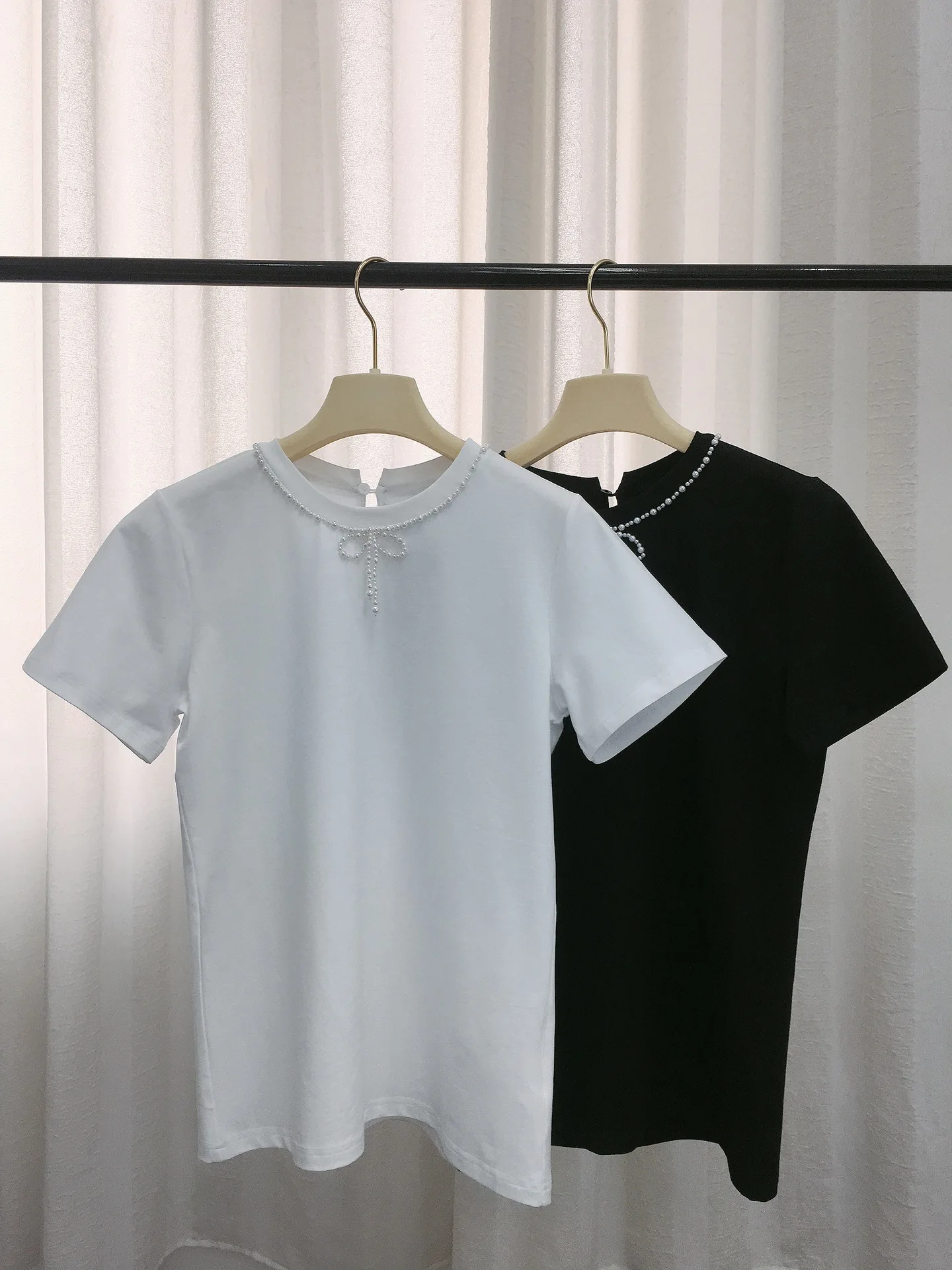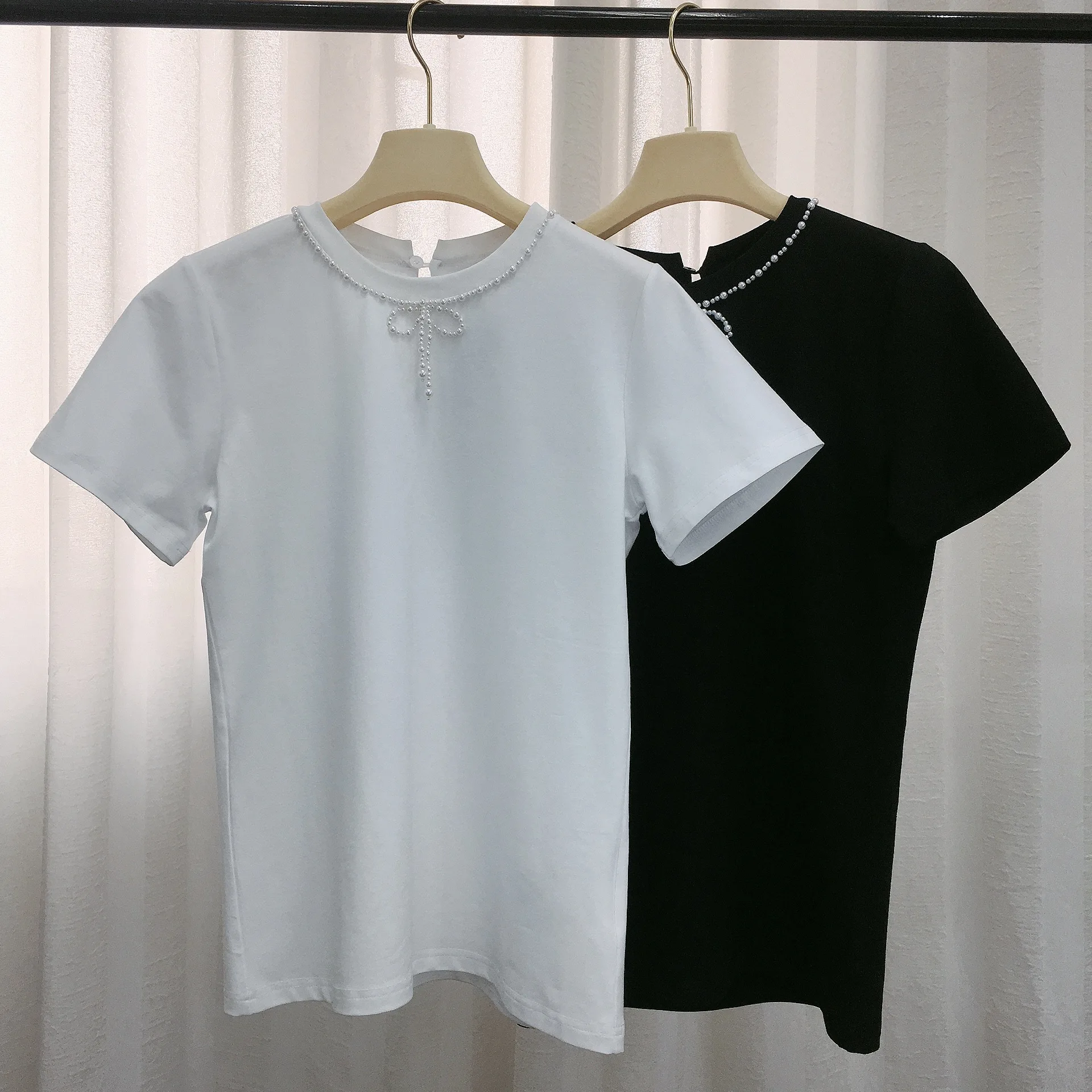 Женская футболка с коротким рукавом, черная или белая футболка с круглым вырезом и жемчужным бантом, повседневная одежда, лето 2021