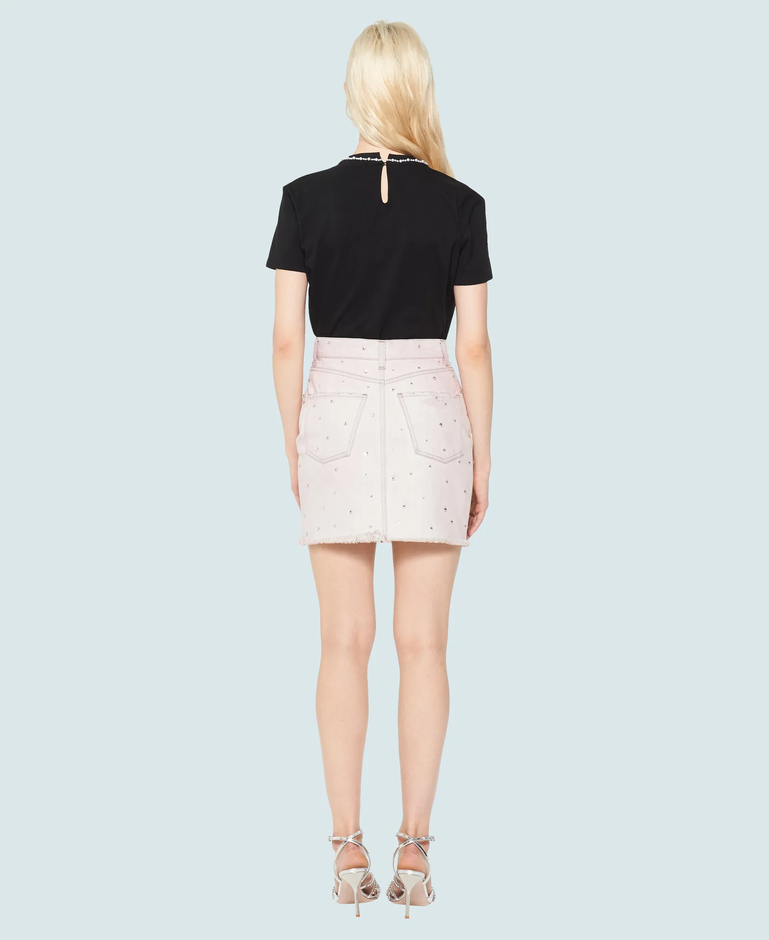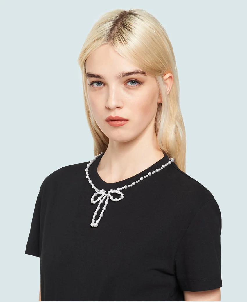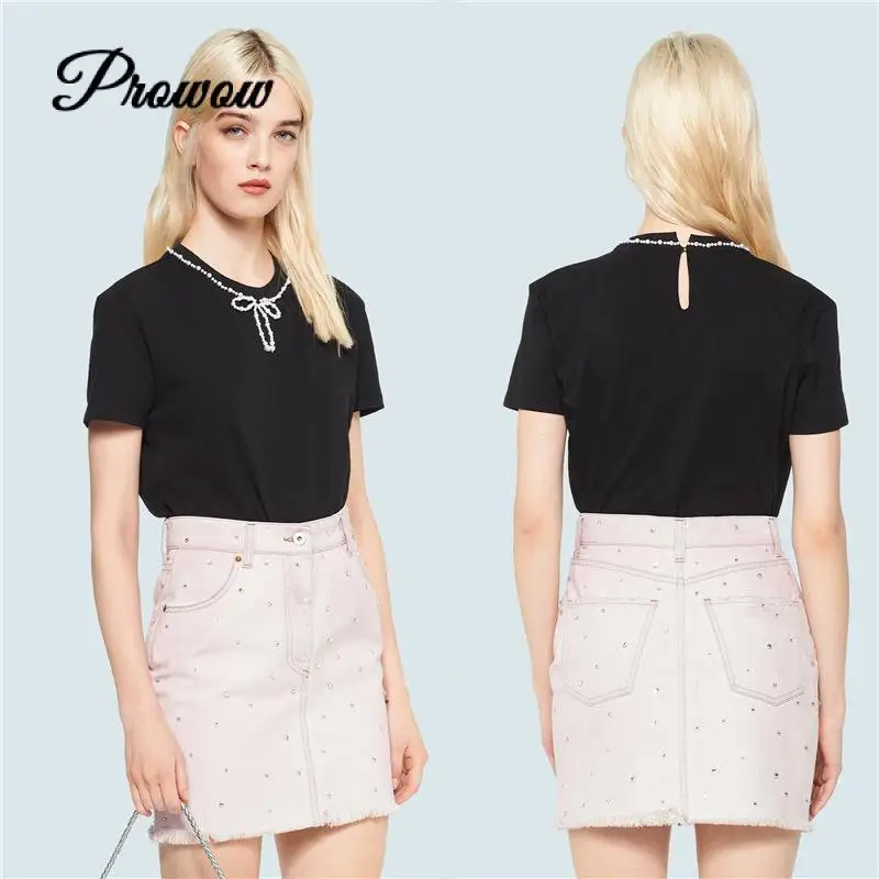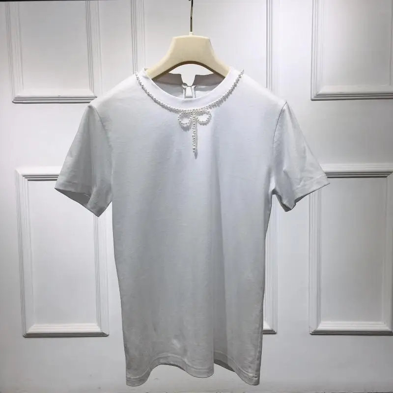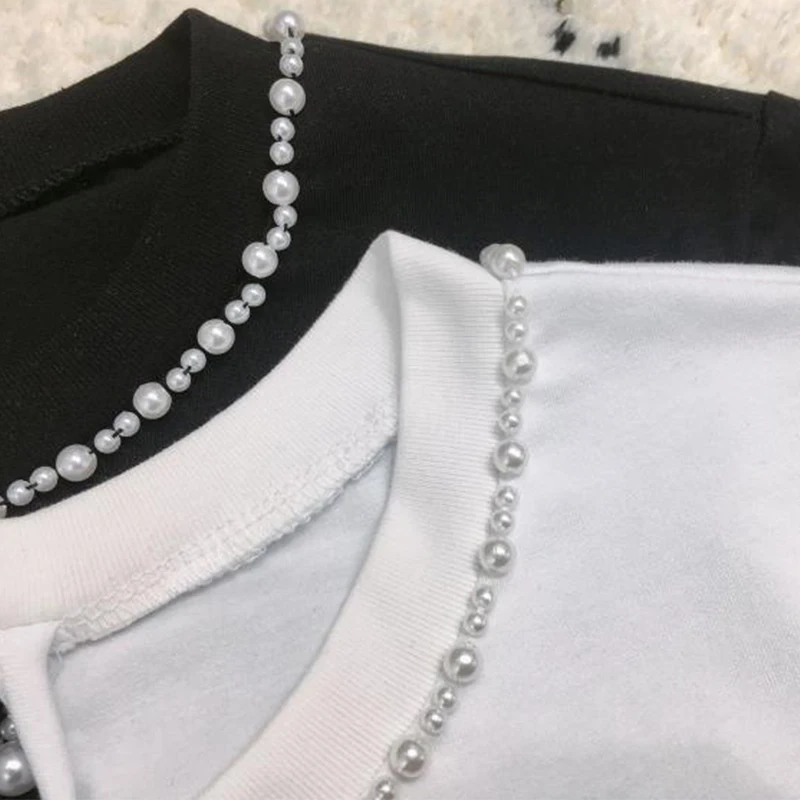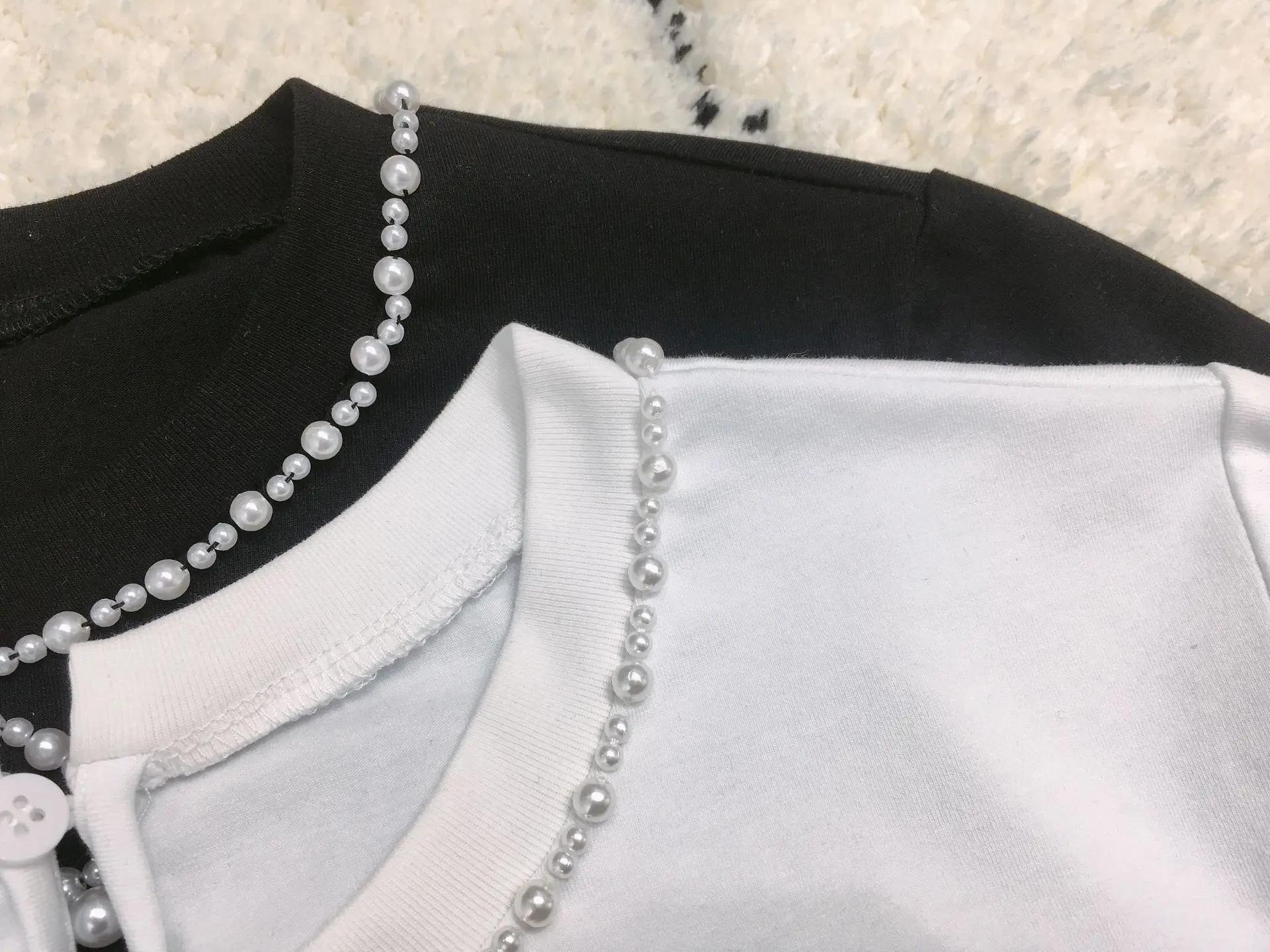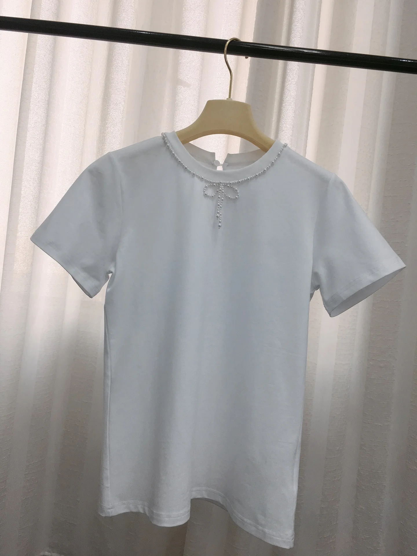 Женская футболка с коротким рукавом, черная или белая футболка с круглым вырезом и жемчужным бантом, повседневная одежда, лето 2021