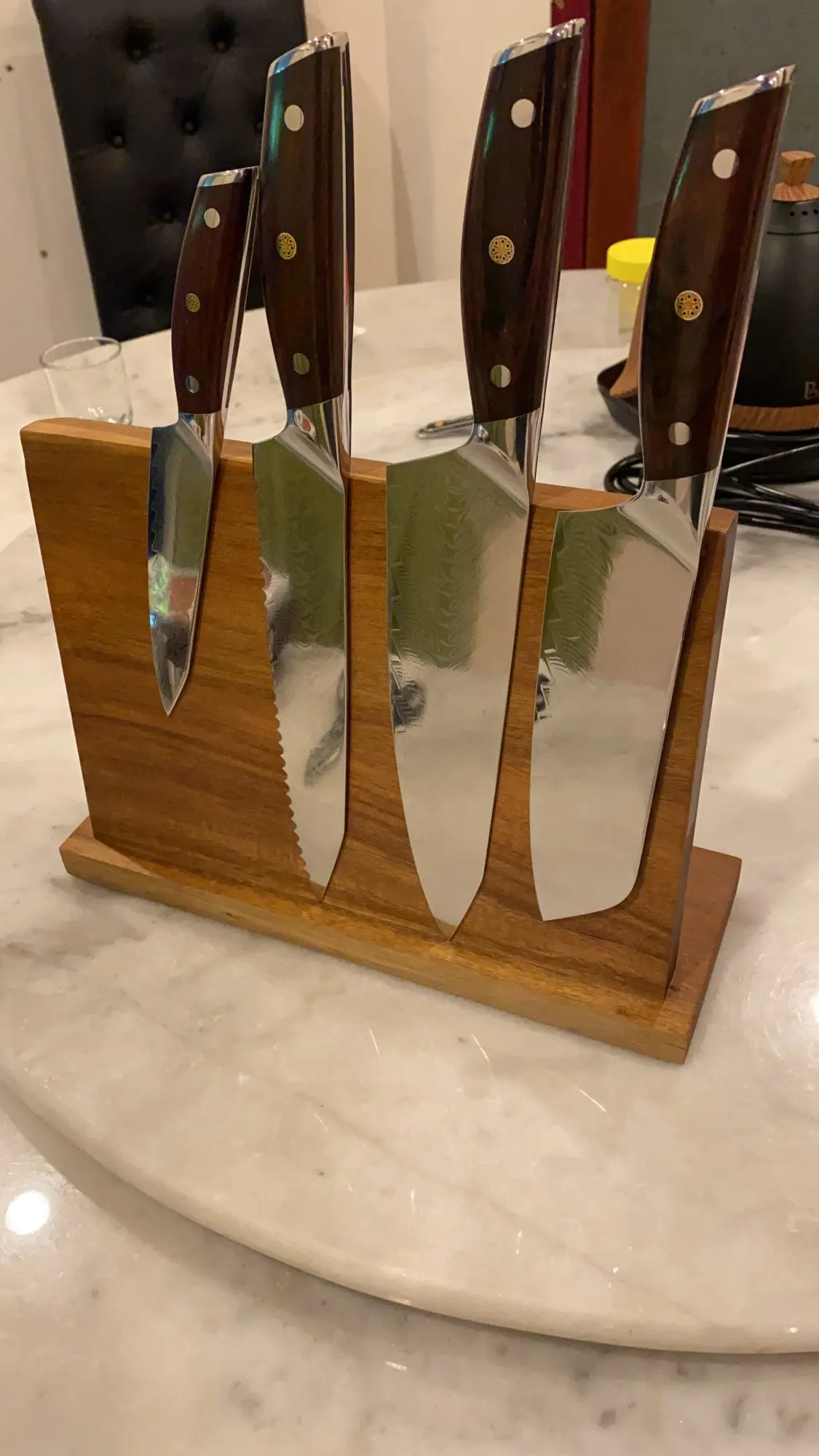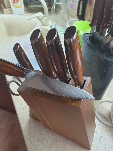 Ножи на данный момент очень острые. Я думаю, это отлично по цене. Один из ножей был поврежден, так как все 5 ножей были набиты в одной коробке. Все они были отдельно обернуты пластиком, бумагой, пузырчатой пленкой с пластиковой защитой на каждом конце лезвия. В конце концов, я купил деревянный магнитный держатель отдельно, и моя единственная жалоба на то, что торчащий нож не будет надежно закреплен. Также я почти уверен, что Паттеры лазурят там, где, как японский Дамаск, будут иметь маркировку от фактического молотка стали. Один из ножей был поврежден, но продавец был очень отзывчив на все мои запросы и вернул мне деньги за тот нож. Я буду продолжать покупать в этом магазине. Я буду стараться действительно использовать эти ножи и видеть, как они работают после заточки точильного камня.