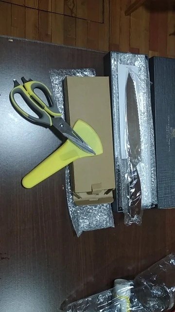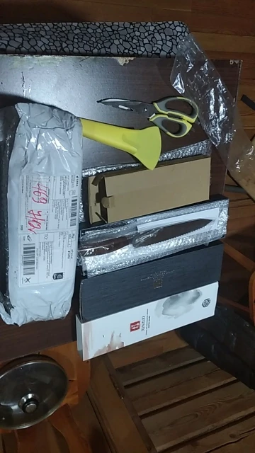 Ножи очень понравились, но будьте осторожны, вместо фирменных ножниц и деревянной подставки могут прислать дешевый ширпотреб в пластиковом чехле, во второй посылке посылке заказанной одновременно ножницы с чехлом даже не положили.