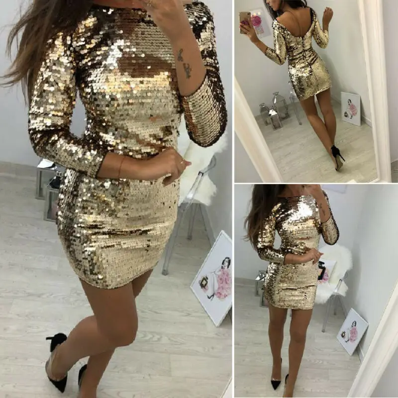 Облегающее женское вечернее мини-платье с золотыми блестками и длинным рукавом