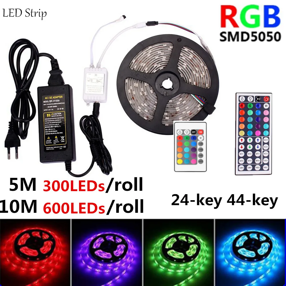 Входит ПДУ с 24 кнопками на 44 кнопки управления SMD5050 Светодиодные ленты 12V RGB светильник лента Водонепроницаемый Гибкая неоновая вывеска для организаций и магазинов 5 м 300 светодиодов/рулон светодиодный светильник s 10, 15 м, 20 м ЕС AU UK штепсельная вилка стандарта США