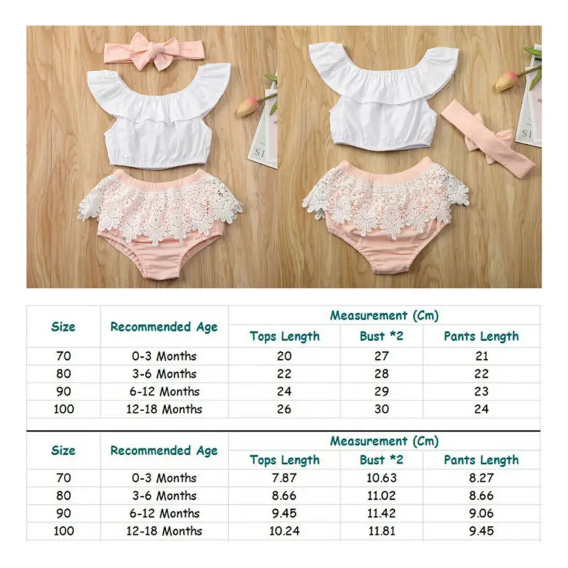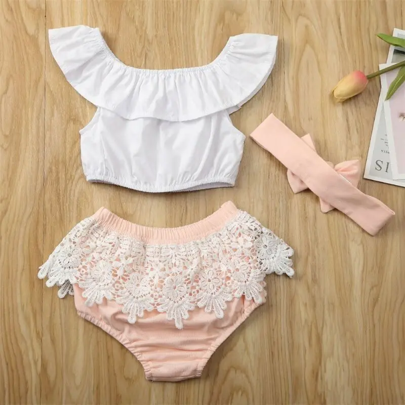 Топ с рюшами для новорожденных девочек; Рубашка; Кружевные штаны; Шорты; Повязка на голову; Комплект летней одежды для маленьких девочек; Костюмы