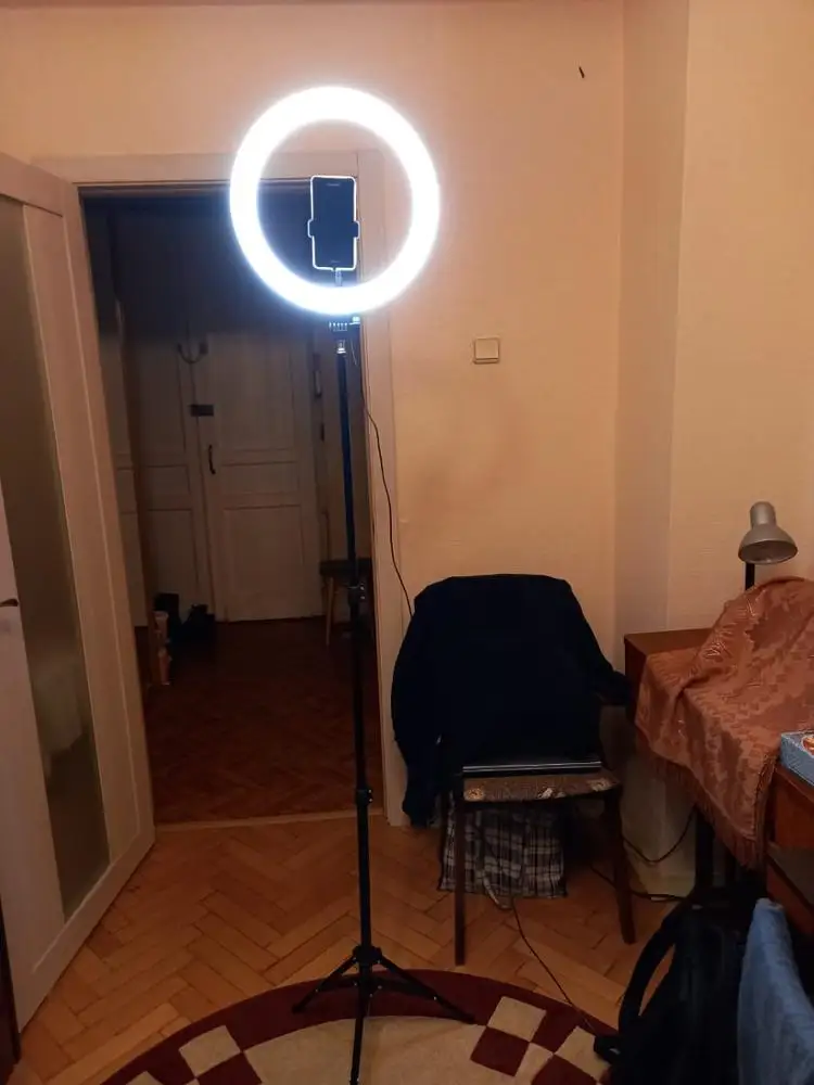 Лампа классная, была хорошо упакована, у неё 3 световых режима, регулируется яркость, штатив высокий, есть держатель для телефона, в общем, всё как в описании. С продавцом не общалась, на Камчатку пришло за пару недель.