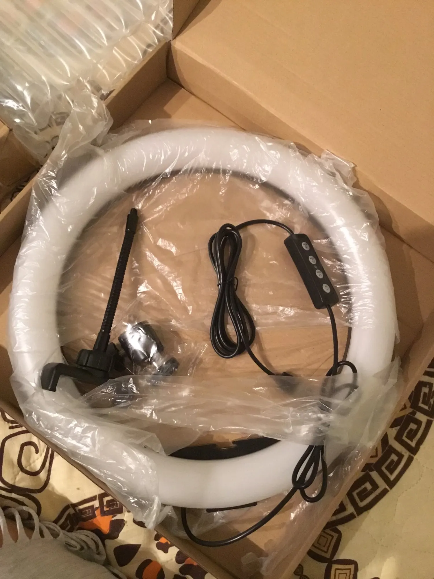 Спасибо продавцу за быструю доставку. Товар пришёл целым, упаковали хорошо. Единственное, на два сантиметра кольцо меньше, чем по описанию. Не 33 см, а 31. Но это не критично. Холодный и тёплый цвета, несколько режим яркости. Позже напишу как в использовании.