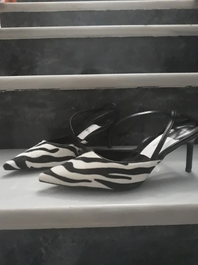 Женские босоножки на тонком высоком каблуке с острым носком и ремешками в виде зебры