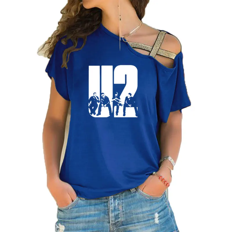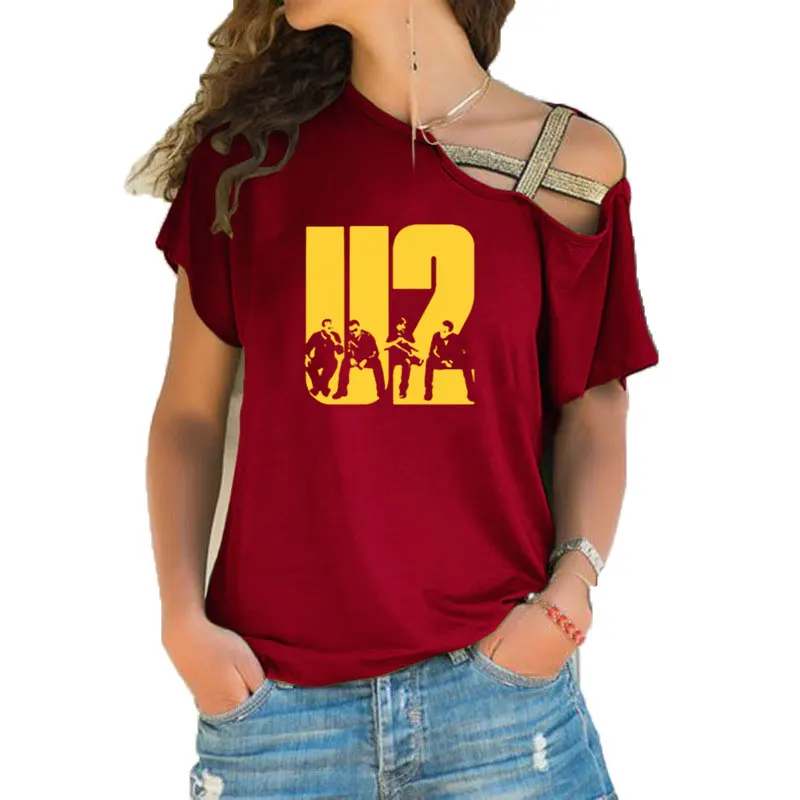 Женская футболка с принтом U2, летняя Милая футболка с коротким рукавом, в стиле хип-хоп, рок, для девушек, асимметричная бандажная футболка с перекрестными полосками