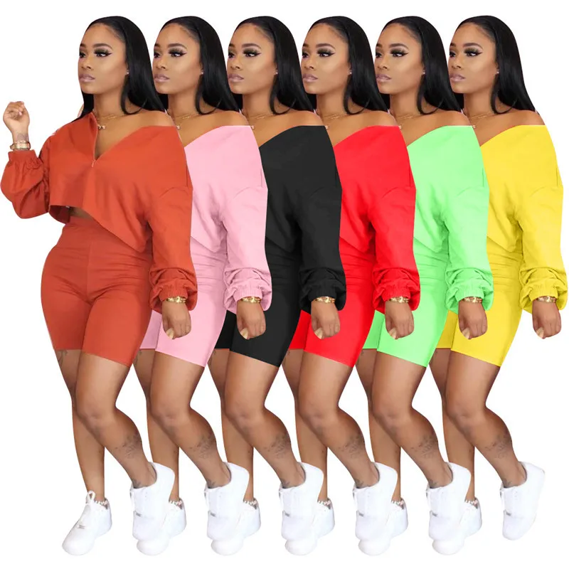 Женский спортивный костюм из двух предметов размера плюс, Топ с длинным рукавом и v-образным вырезом, велосипедные шорты, комплект из 2 предметов, одежда для отдыха
