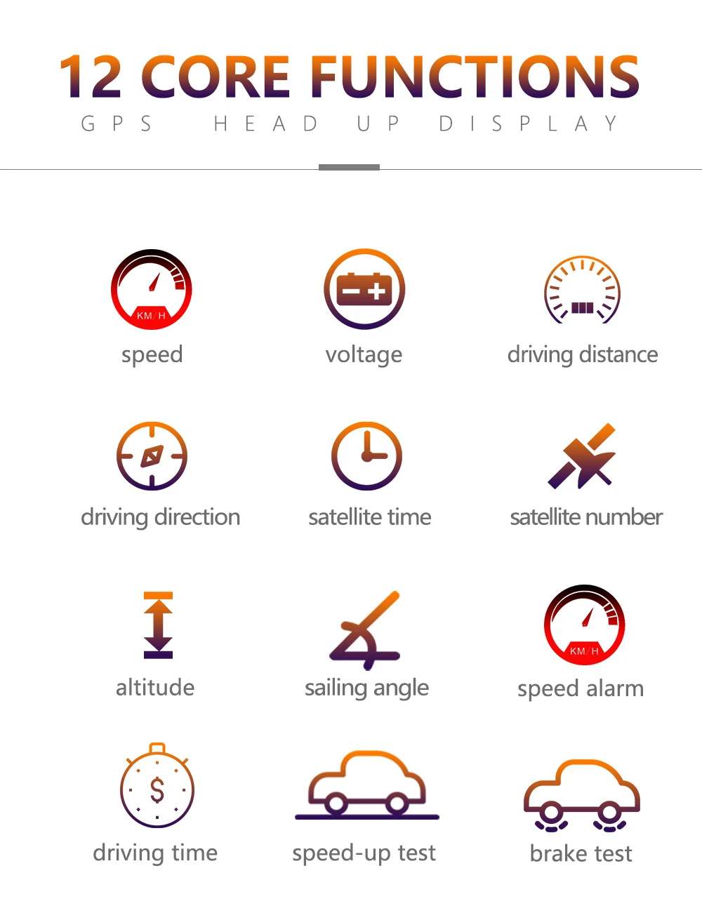 Подходит для всех транспортных средств-В отличие от других автомобильных сидений, вам не нужно беспокоиться о совместимости, T800 может работать для всех транспортных средств, независимо от того, какой бренд или какая модель по всему миру, потому что T800 основан на модуле GPS внутри. На тонкопленочных транзисторах на тонкоплёночных транзисторах ЖК-дисплей дисплей-T800 HUD оснащен высокой четкости 4,3 ''TFT ЖК-дисплей экран, который показывает информацию, которая более лучше, чем на лобовое стекло, компанид с разноцветный функция переключения это позволит вам чувствовать себя более комфортно, контролируя скорость и принося больше удовольствия вашему вождению. Насыщенное содержание-Почти все, что вам может понадобиться для чтения во время вождения, будет показано этим HUD, включая скорость, время в пути, Спутниковое время, высоту, количество спутников, направление движения, один пробег, напряжение, испытание на ускорение, испытание на тормоз. Сигнализация: Сигнализация с превышением скорости, сигнализация с низким напряжением, свободное переключение между километром и милями, км/ч MPH переключатель. Отличный партнер для вождения. Многофункциональность-T800 HUD был модернизирован с новыми функциями, которые делают его другим и более конкурентоспособным, чем традиционный HUD на рынке. Поскольку T800 основан на gps-модуле и спутнике, его можно использовать для тестирования скорости, тестирования производительности тормозов и чтения другой информации о автомобиле. Многофункциональный инструмент, который поможет вам узнать о вашем автомобиле. Один год гарантии-У него есть сертификаты CE, FCC, RoHS, поддержка электронной почты: sales@vjoycar.com