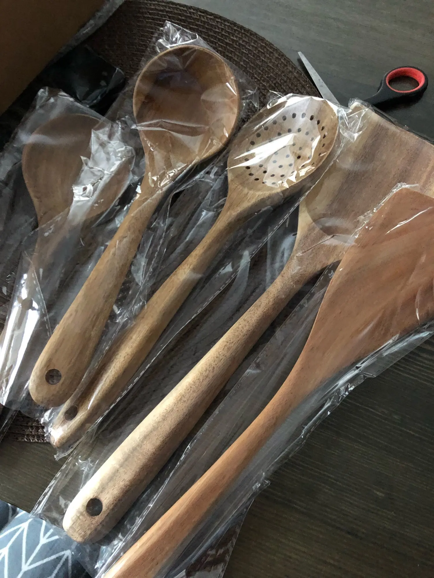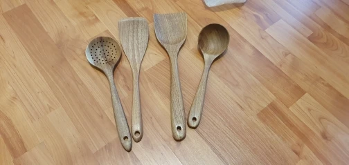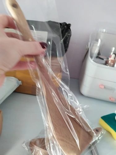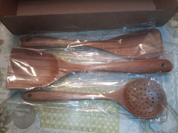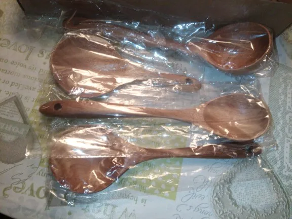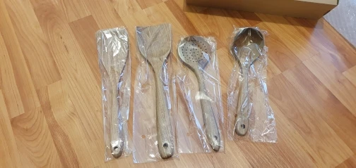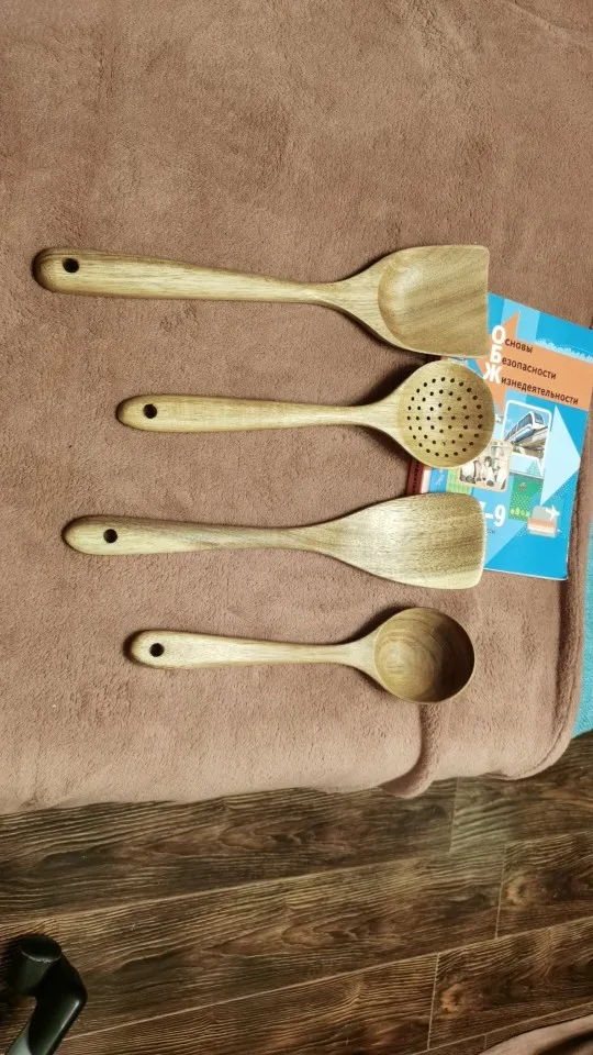 Очень классные приборы!!! Пришли быстро, в СПб за две недели с момента заказа! Упакованы в классную коробочку и каждая ложка в отдельном пакетике. У одной лопатке слишком шершавый край, но можно легко подпилить и все будет хорошо. На моё удивление они оказались очень легкие, поэтому немного непривычно готовить после пластмассовой лопатки, но очень приятно и эстетично:) из маленькой плоской ложечки придумала подставку под лопатки при готовке, очень удобно. Все! Сдаю на переработку свои старые пластиковые лопатки и радуюсь этим красивым новым деревянным!!! Спасибо продавцу за такой хороший товар! К заказу рекомендую:)