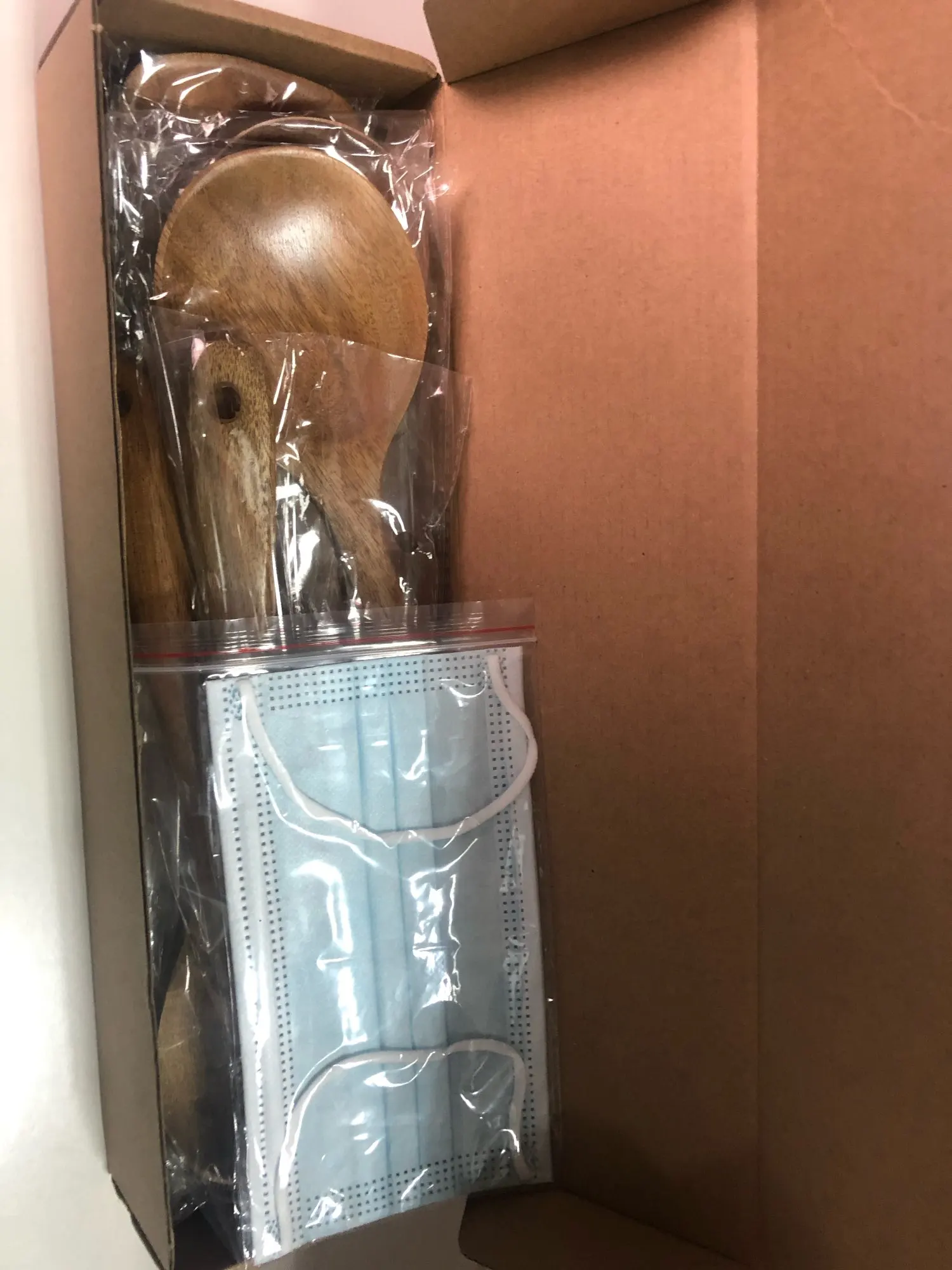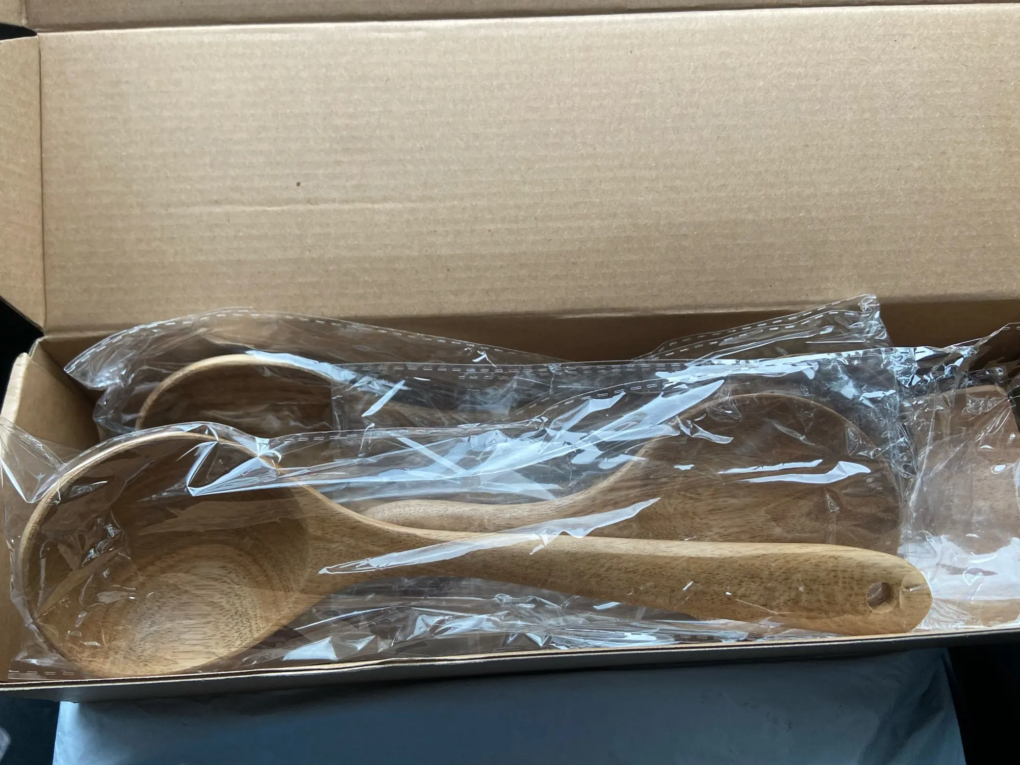 Товар пришел с браком на ложке была маленькая вмятина и на лопатке была дырка на сквозь, открыла спор деньги заявленные вернули. Одна ложка отличалась внешне от всего набора, она покрыта лаком. Набор мне не понравился, дерево слишком легкое и какое-то неоднородное, как будто фанера, т. к. из этого дерева я покупала в магазине похожие принадлежности и они были существенно тяжелее. Товар пришел быстро.