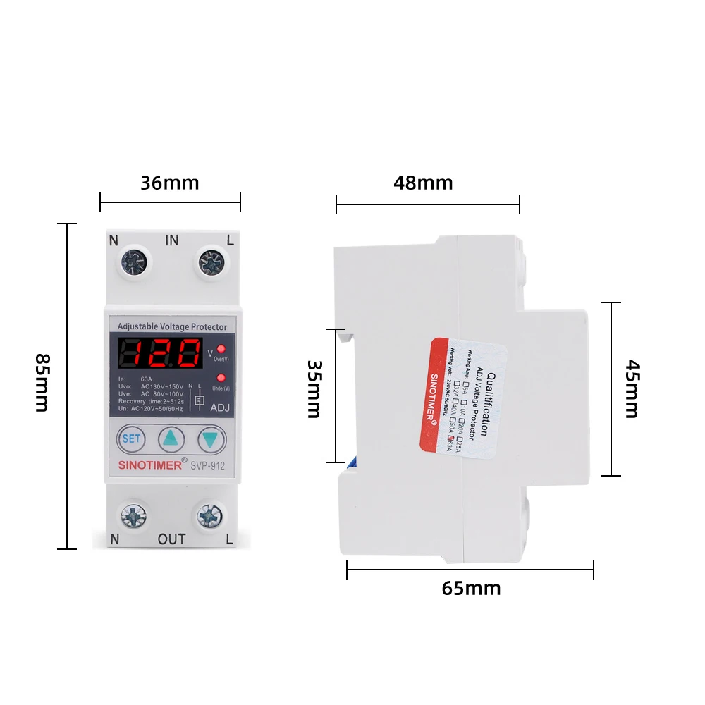 Функции: 1. Защита от перенапряжения 2. Защита от пониженного напряжения 3. Автоматическое восстановление 4. Вольтметр Параметры изделия: 1. Номер модели: SVP912 2. Источник питания: 120В переменного тока 50/60 Гц 3. Макс. Мощность загрузки: 63А 4. Диапазон значений защиты от перенапряжения: 130 В ~ 150 ~ ВЫКЛ. (по умолчанию: 140 в) Диапазон напряжения восстановления перенапряжения: 131 в ~ 149 в Время действия защиты от перенапряжения: 0,1 s ~ 10s (значение по умолчанию: 0,1 s) 5. Диапазон значений защиты от пониженного напряжения: 100 В ~ 80 В ~ ВЫКЛ. (по умолчанию: 90 в) Диапазон восстановительного напряжения под напряжением: 81 в ~ 99 в Время действия защиты от пониженного напряжения: 0,1 s ~ 10s (по умолчанию: 0,1 s) 6. Время задержки восстановления: 2s ~ 512s (по умолчанию: 60s) 7. Время задержки после включения: 2s ~ 255s (по умолчанию: 2s) 8. Потребляемая мощность: <2 Вт 9. Срок службы электротехники: 100000 000 раз 10. Установка: DIN-рейка 35 мм