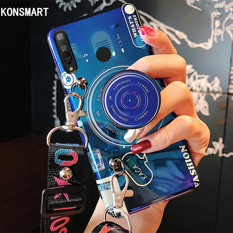 KONSMART чехол для Huawei Y7P, 3D камера, модный синий силиконовый чехол с подставкой для телефона P40 Lite E 6,39 ", мягкая задняя крышка с ремешком