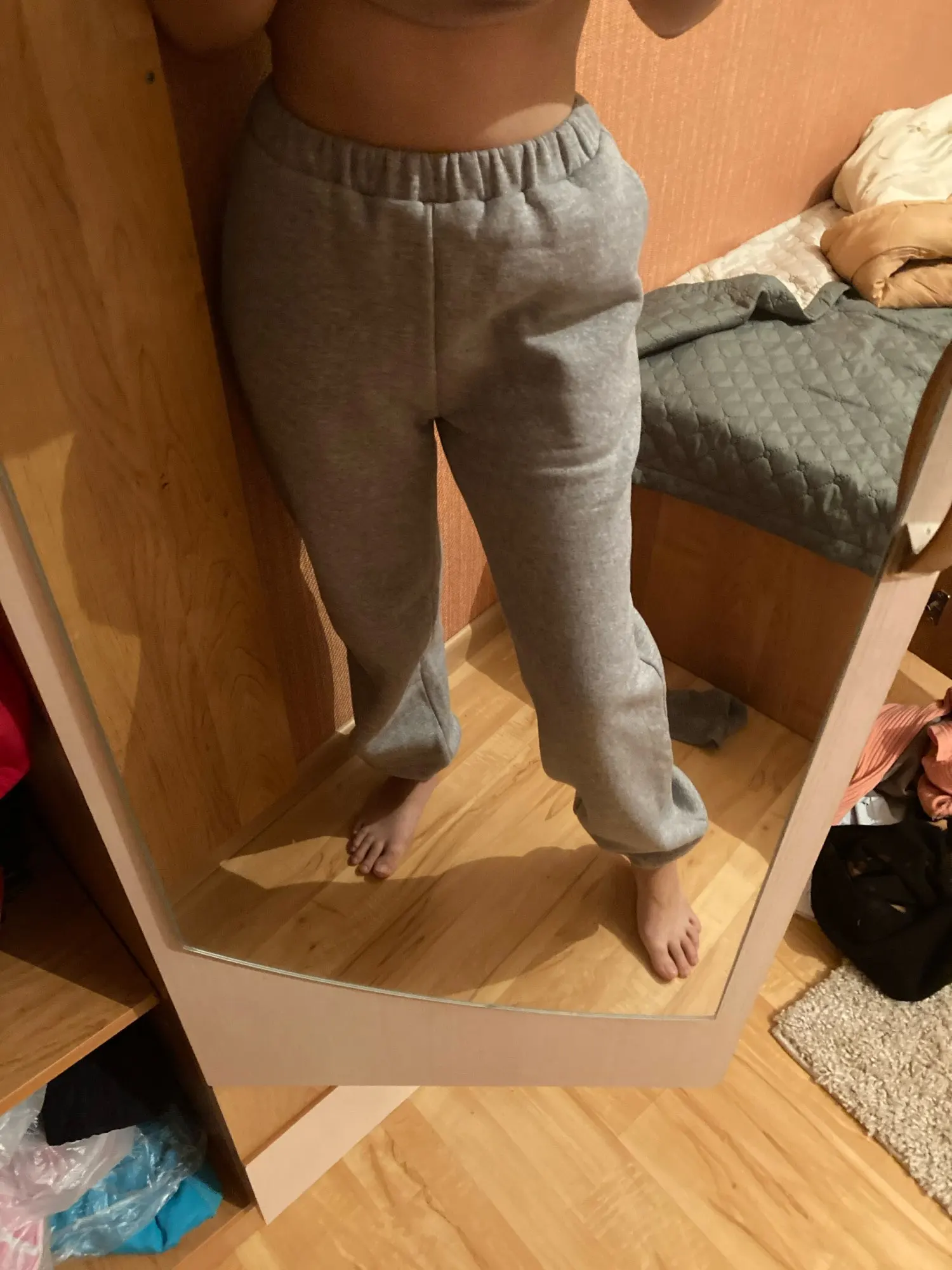 Шёл очень долго, материал плотный мягкий на ощупь. Покупала размер М на параметры рост 158, об 88 и они немного длинные, но для моего бомж стайла нормально. Сразу скажу что резинка выглядит отвратительно, носить буду закрывая верхнюю часть. Не знаю как с качеством и как будут носится как появятся катышки дополню отзыв. В некоторых местах есть ниточки.