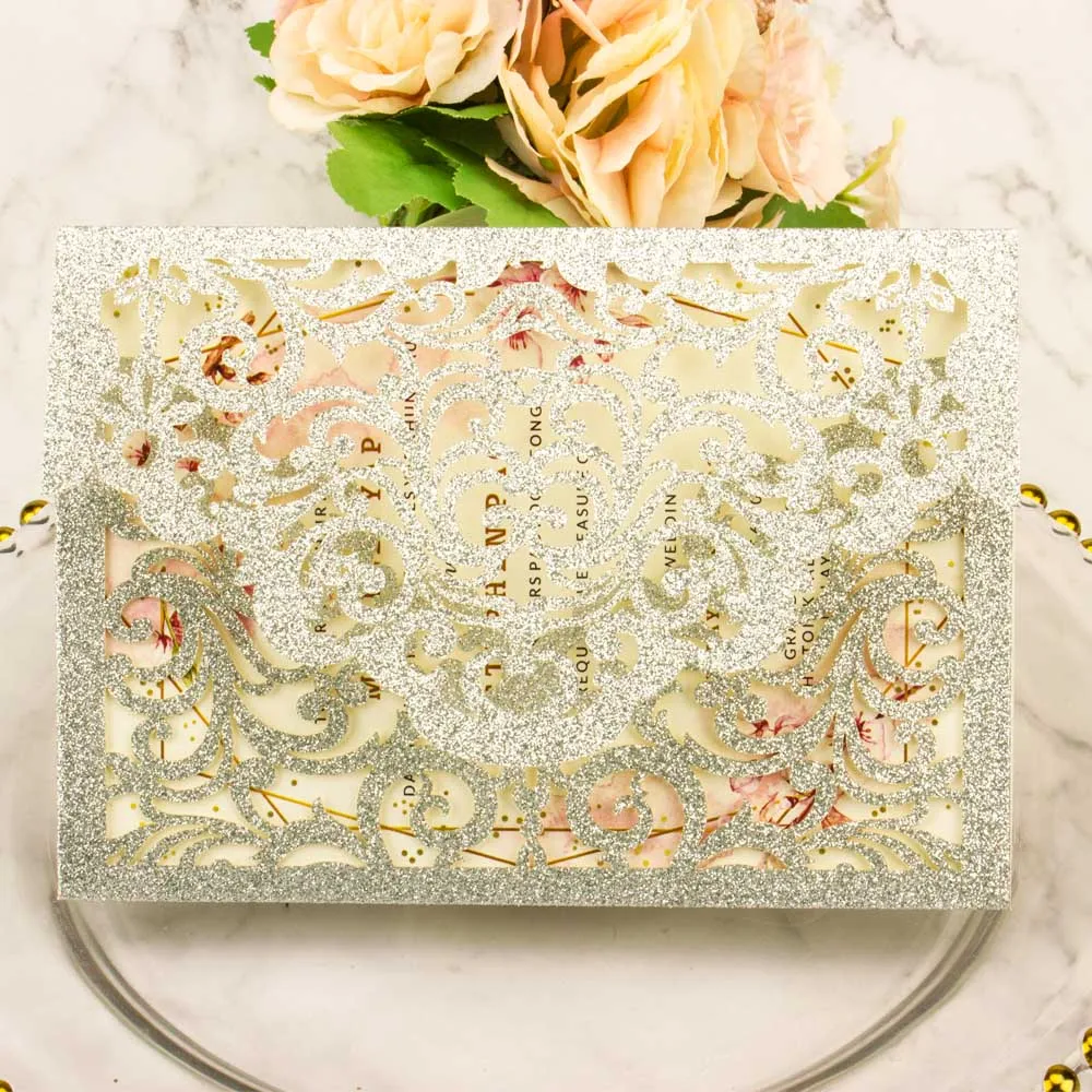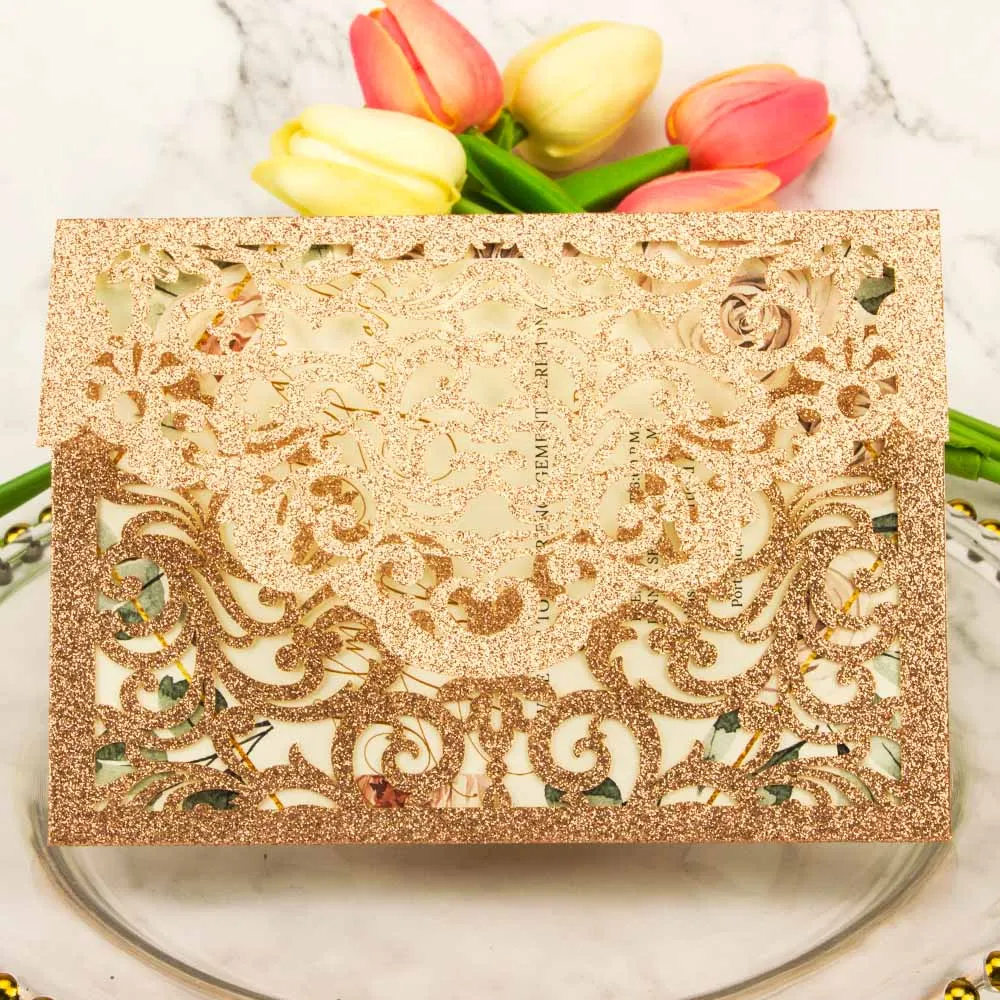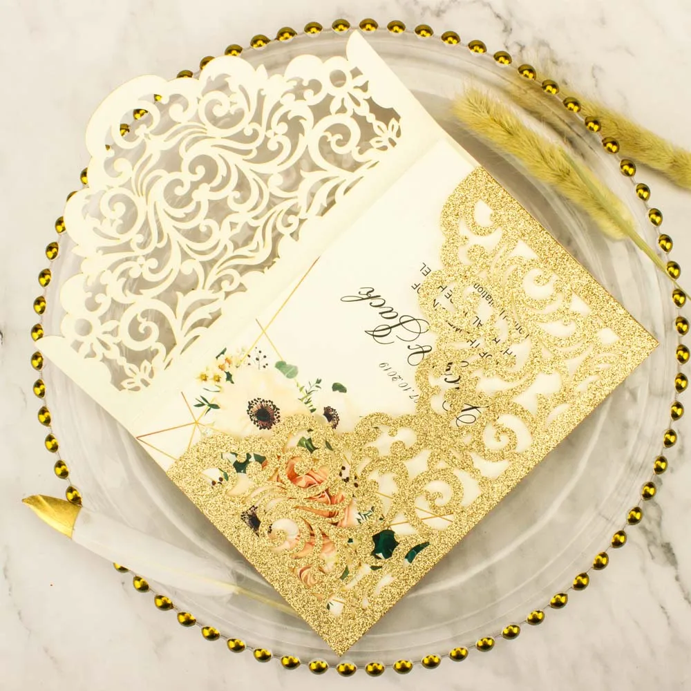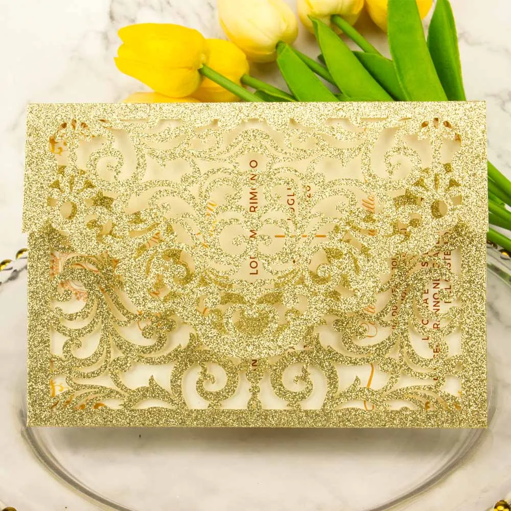 1 шт. бесплатный образец полые лазерная резка блестящие бумажные свадебные пригласительные открытки с тиснением оптовая продажа поздравительных карманных пригласительных обложек