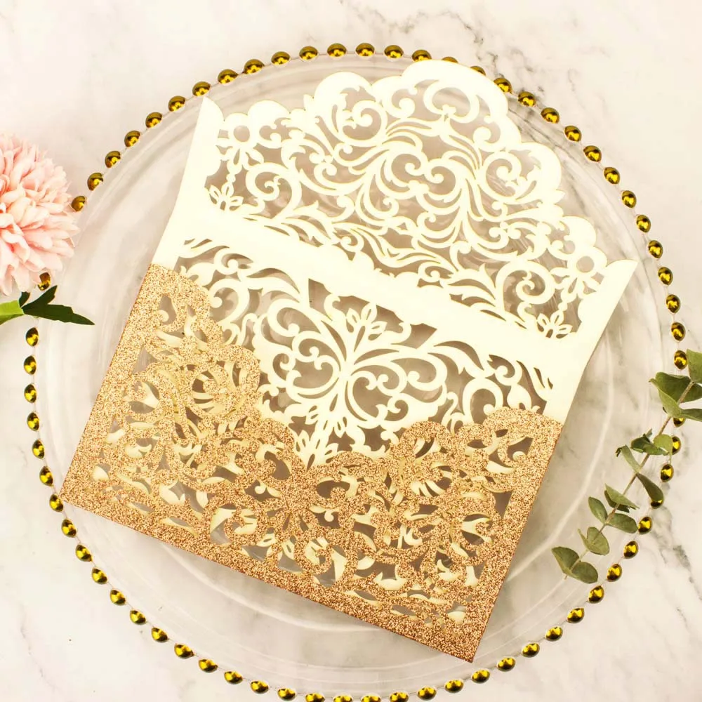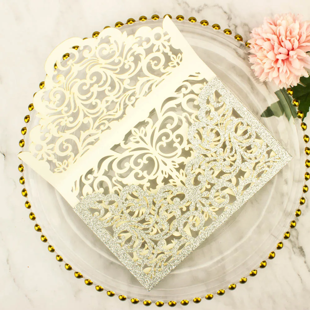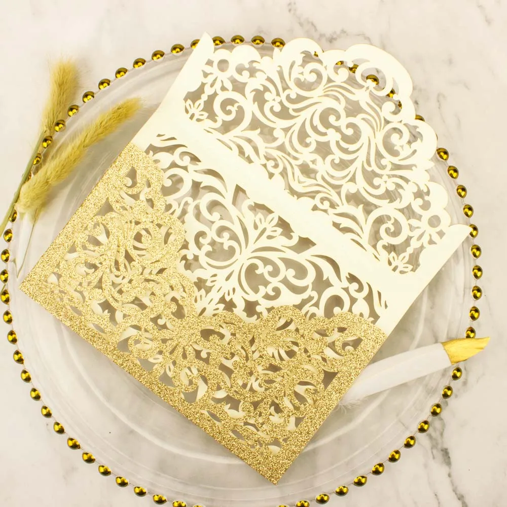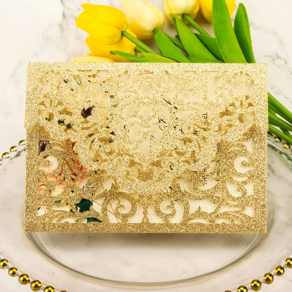 1 шт. бесплатный образец полые лазерная резка блестящие бумажные свадебные пригласительные открытки с тиснением оптовая продажа поздравительных карманных пригласительных обложек