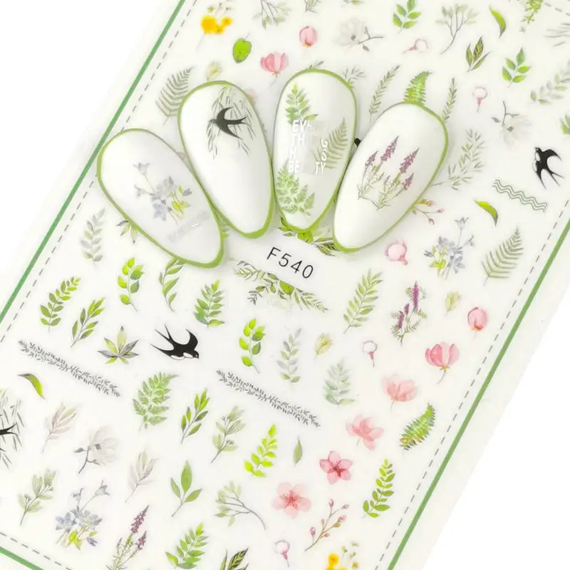 Наклейки для ногтей с зеленым листом и ласточкой, наклейки для мани...