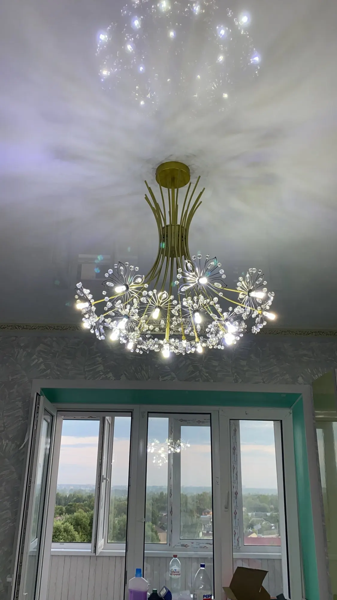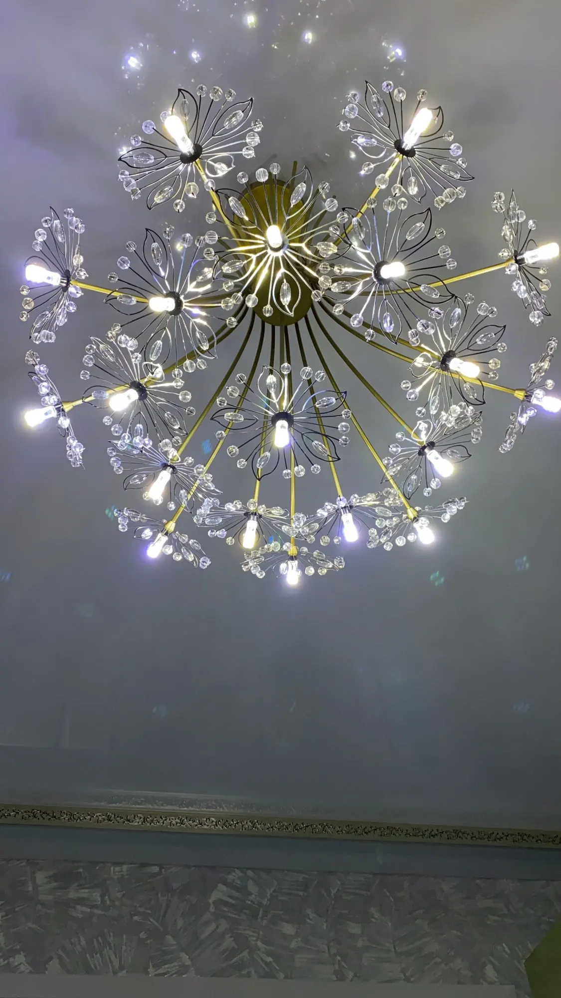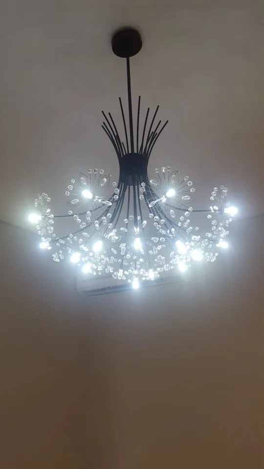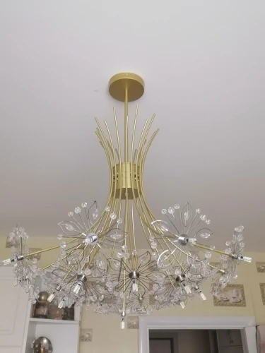 Собирали несколько часов. Совет. В начале распакуйте и разровняйте цветочки, потом вызывайте электрика. Цветочки приходят замотанные в куль, все мнутся. Но легко разгибаются в первоначальное состояние. Лампочки положили 20 штук. Собирается через один более загнутые, менее загнутые. Свекровь сказала, что смотрится как "произведение искусства" и это действительно так. В комплекте на выбор 20 и 30 см крепление к потолку. Мы повесили на 30 - так видна вся красота. Для низких потолков не подойдёт однозначно. У нас 2.60 высота. Люстра очень красивая. Рекомендую. Вживую ещё лучше смотрится. Доставка курьером дней за 10-12 пришло. Буду и вторую Люстру тут брать. Продавцу большое спасибо.
