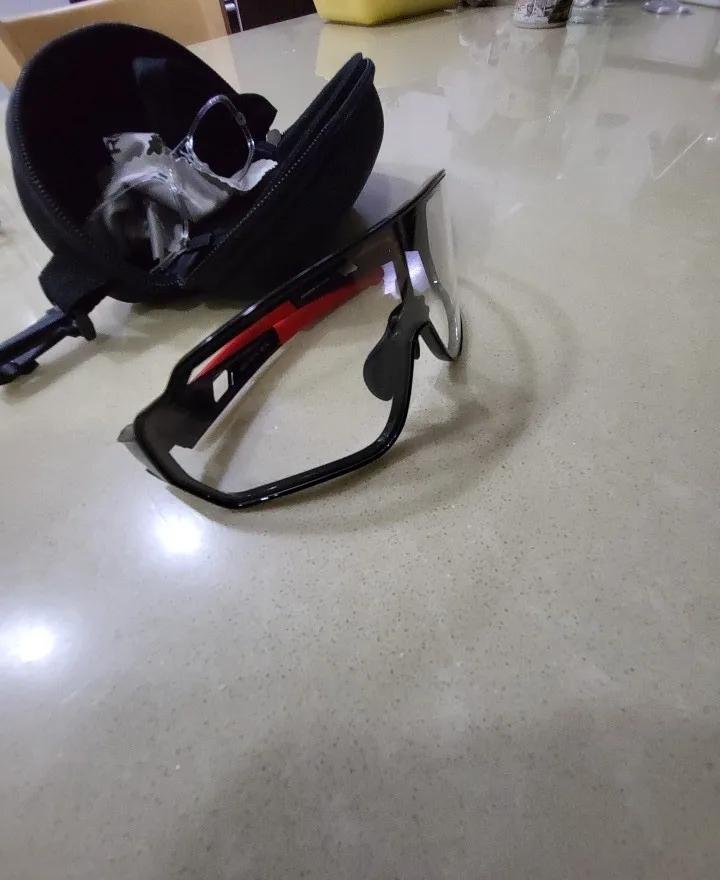 Очень классные очки. Когда нет солнца абсолютно прозрачные. Очень быстро затемняются и становятся прям чёрные, что не видно глаз. Не запотевают, а если и дыхнуть на них, то моментально отпотели. Неплохо сидят. В комплекте твёрдый чехол, мешочек, тряпка из микрофибры, штука, чтобы оптические стекла вставлять. У твёрдого чехла ещё есть крючок с защелкой, чтобы вешать куда-то.
