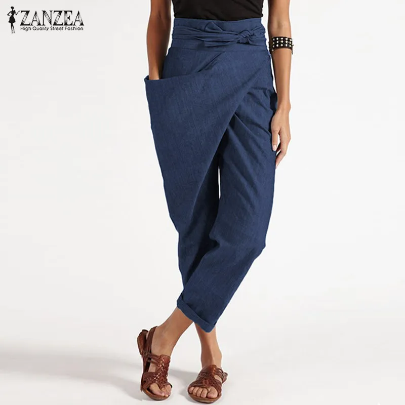 2021 ZANZEA женские шаровары, Летние Элегантные штаны с высокой талией, модные укороченные брюки на молнии со шнуровкой, повседневные длинные брюки палаццо